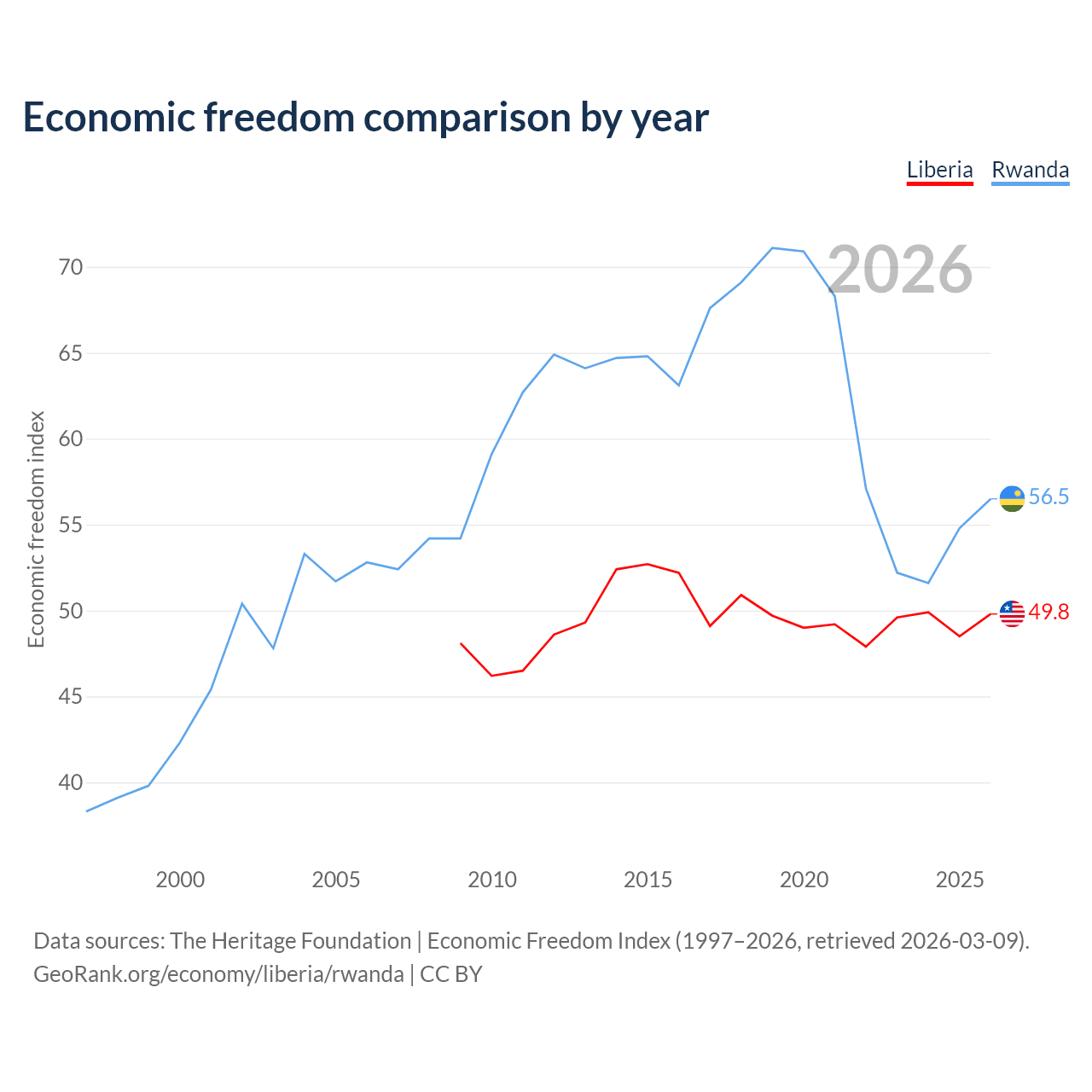 The Economic Freedom Index for Liberia is 49.8, ranking 163/197, compared to 56.5 for Rwanda, ranking 121/197. The chart above displays a comparison of annual changes in economic freedom indexes.