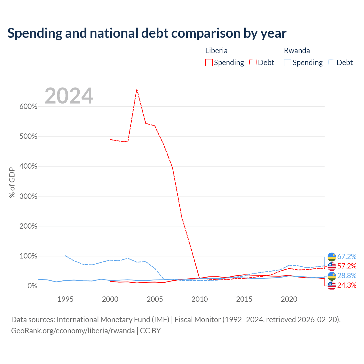 Liberia has $2.73B in government debt (57.2% of GDP), compared to $9.58B (67.2% of GDP) in Rwanda.