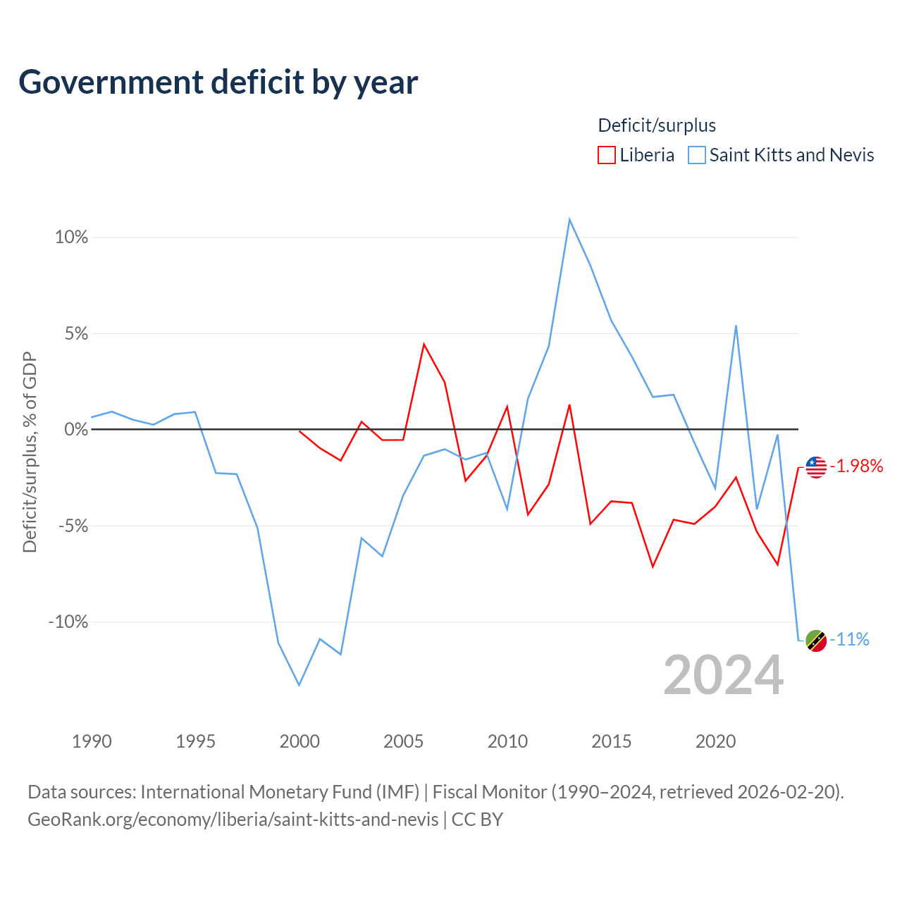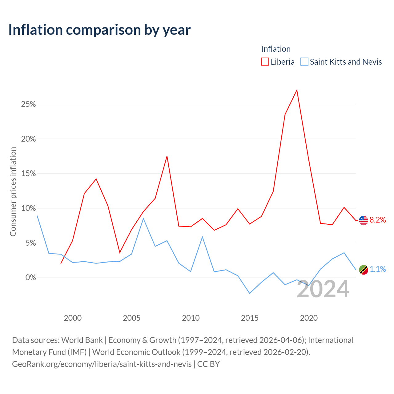 Over the past 26 years, Liberia has recorded an average annual inflation rate of 10.4%, compared with 1.95% in Saint Kitts and Nevis. In 2024, inflation was 8.2% in Liberia and 1.1% in Saint Kitts and Nevis.