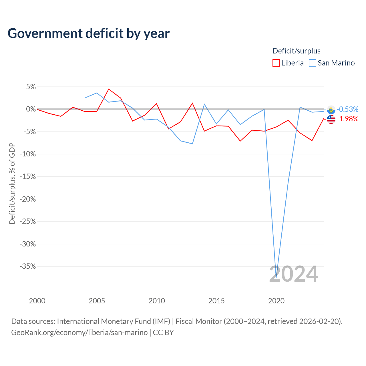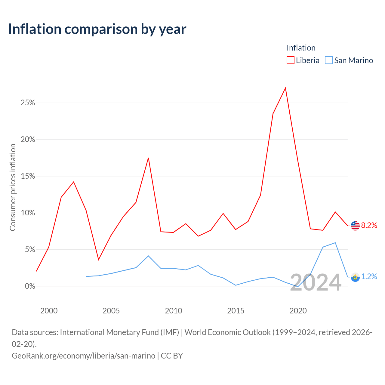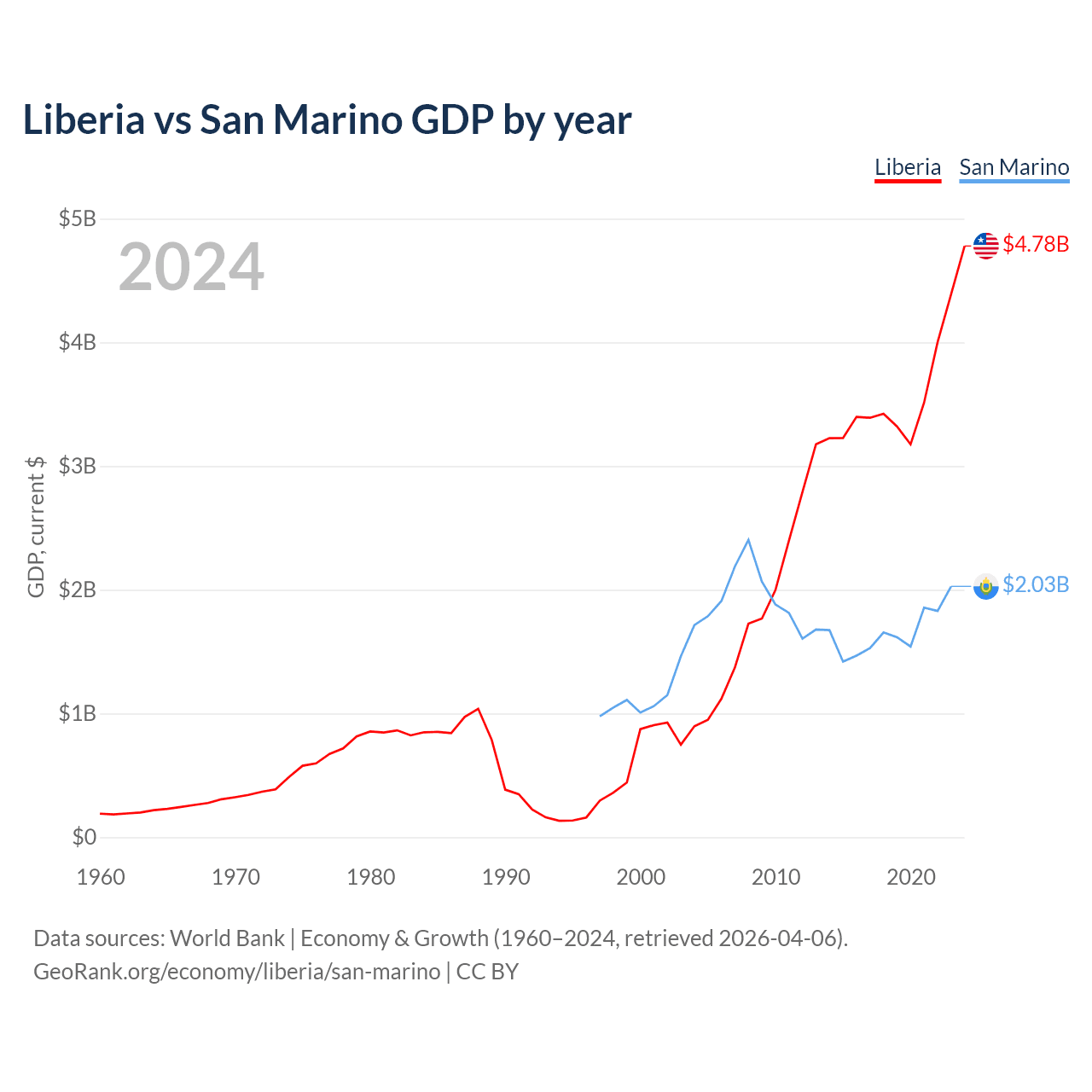Liberia has a GDP of $4.78B compared to $2.03B for San Marino, ranking 163/197 and 180/197 by economy size, respectively.