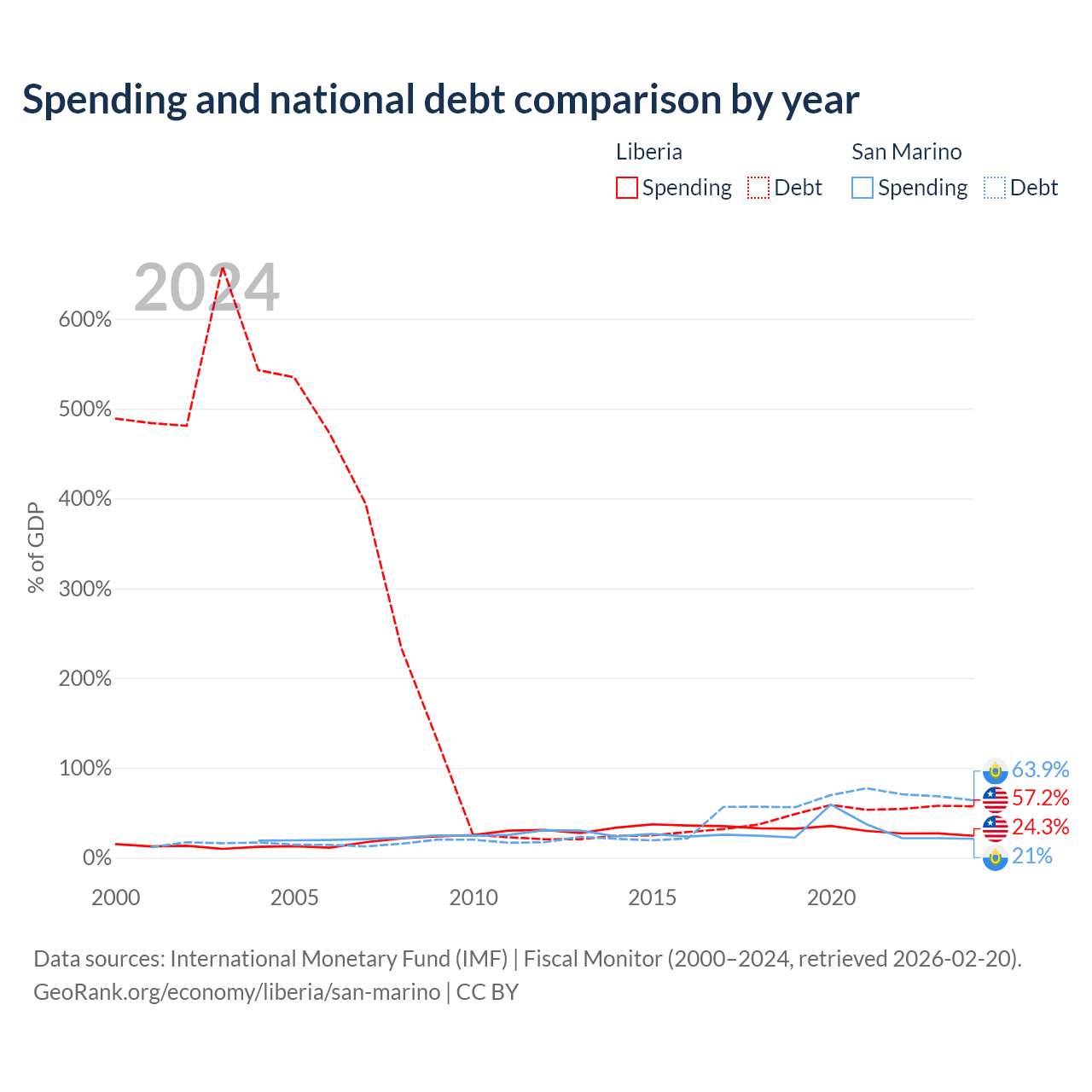 Liberia has $2.73B in government debt (57.2% of GDP), compared to $1.39B (63.9% of GDP) in San Marino.
