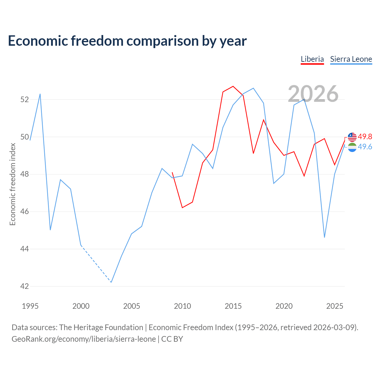 The Economic Freedom Index for Liberia is 49.8, ranking 163/197, compared to 49.6 for Sierra Leone, ranking 165/197. The chart above displays a comparison of annual changes in economic freedom indexes.