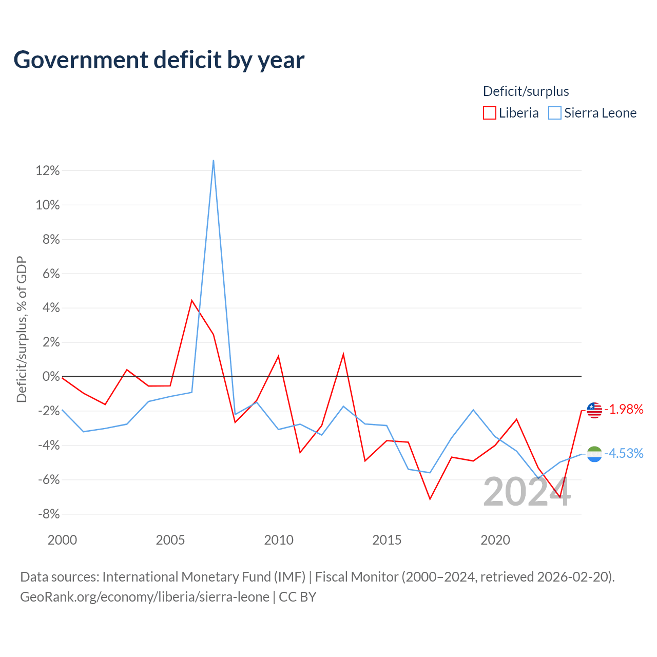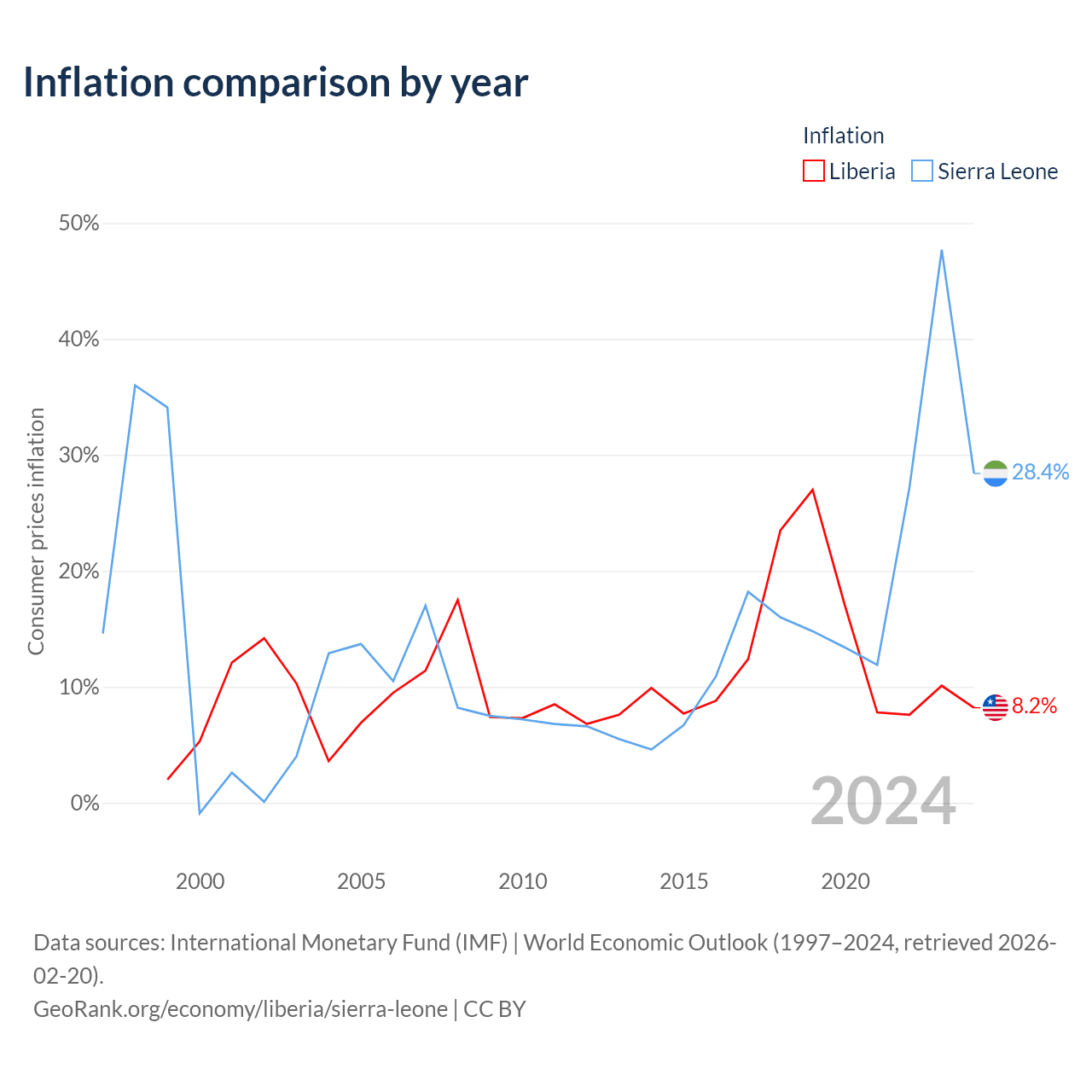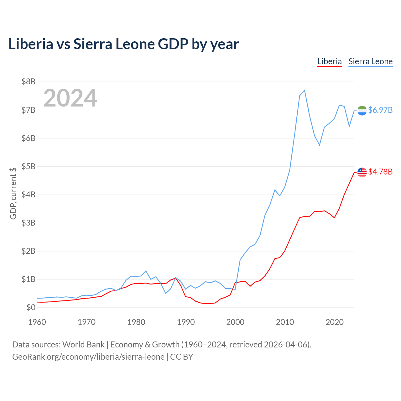 Liberia has a GDP of $4.78B compared to $6.97B for Sierra Leone, ranking 163/197 and 160/197 by economy size, respectively.