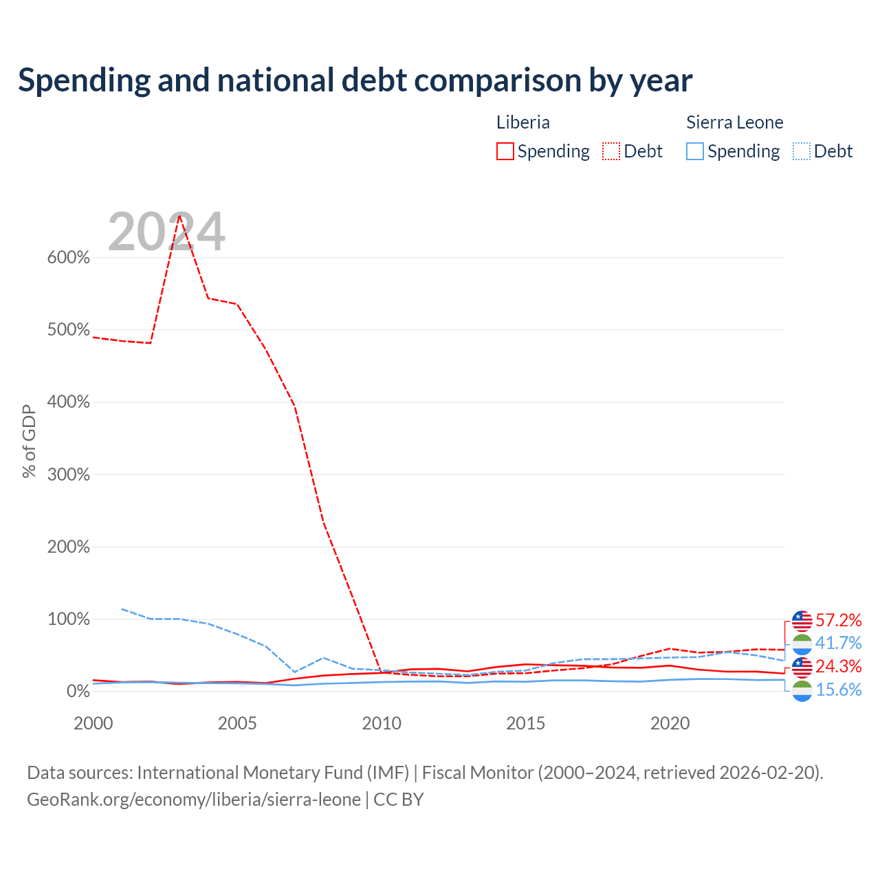 Liberia has $2.73B in government debt (57.2% of GDP), compared to $2.91B (41.7% of GDP) in Sierra Leone.