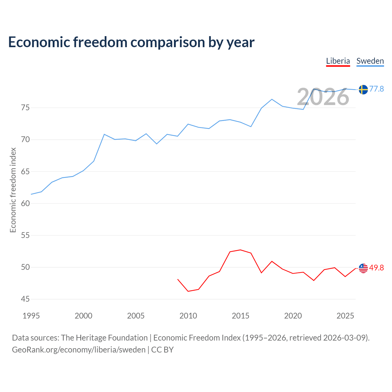 The Economic Freedom Index for Liberia is 49.8, ranking 163/197, compared to 77.8 for Sweden, ranking 14/197. The chart above displays a comparison of annual changes in economic freedom indexes.