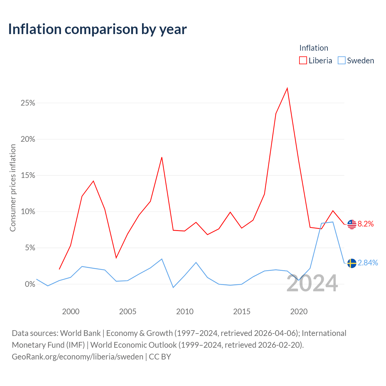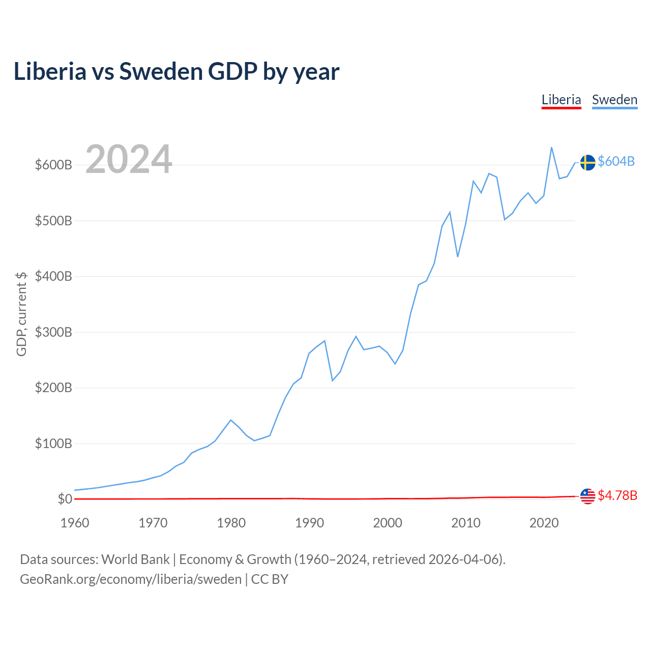 Liberia has a GDP of $4.78B compared to $604B for Sweden, ranking 163/197 and 26/197 by economy size, respectively.