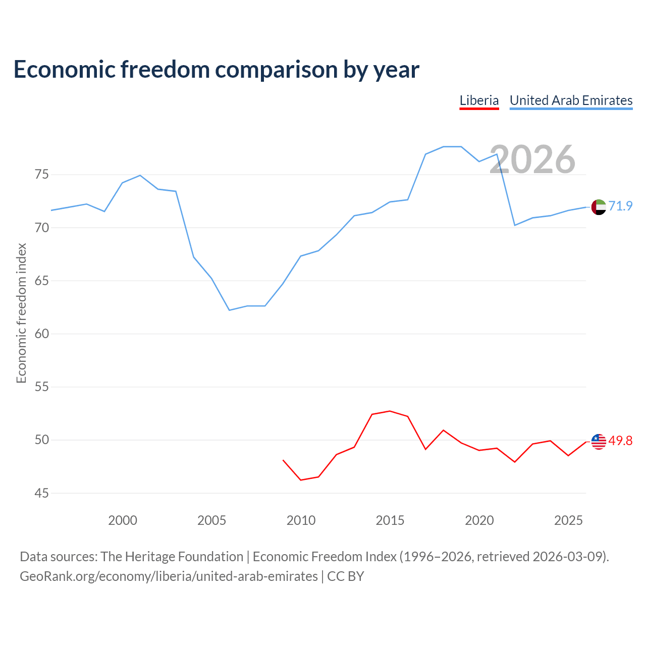 The Economic Freedom Index for Liberia is 49.8, ranking 163/197, compared to 71.9 for the United Arab Emirates, ranking 29/197. The chart above displays a comparison of annual changes in economic freedom indexes.