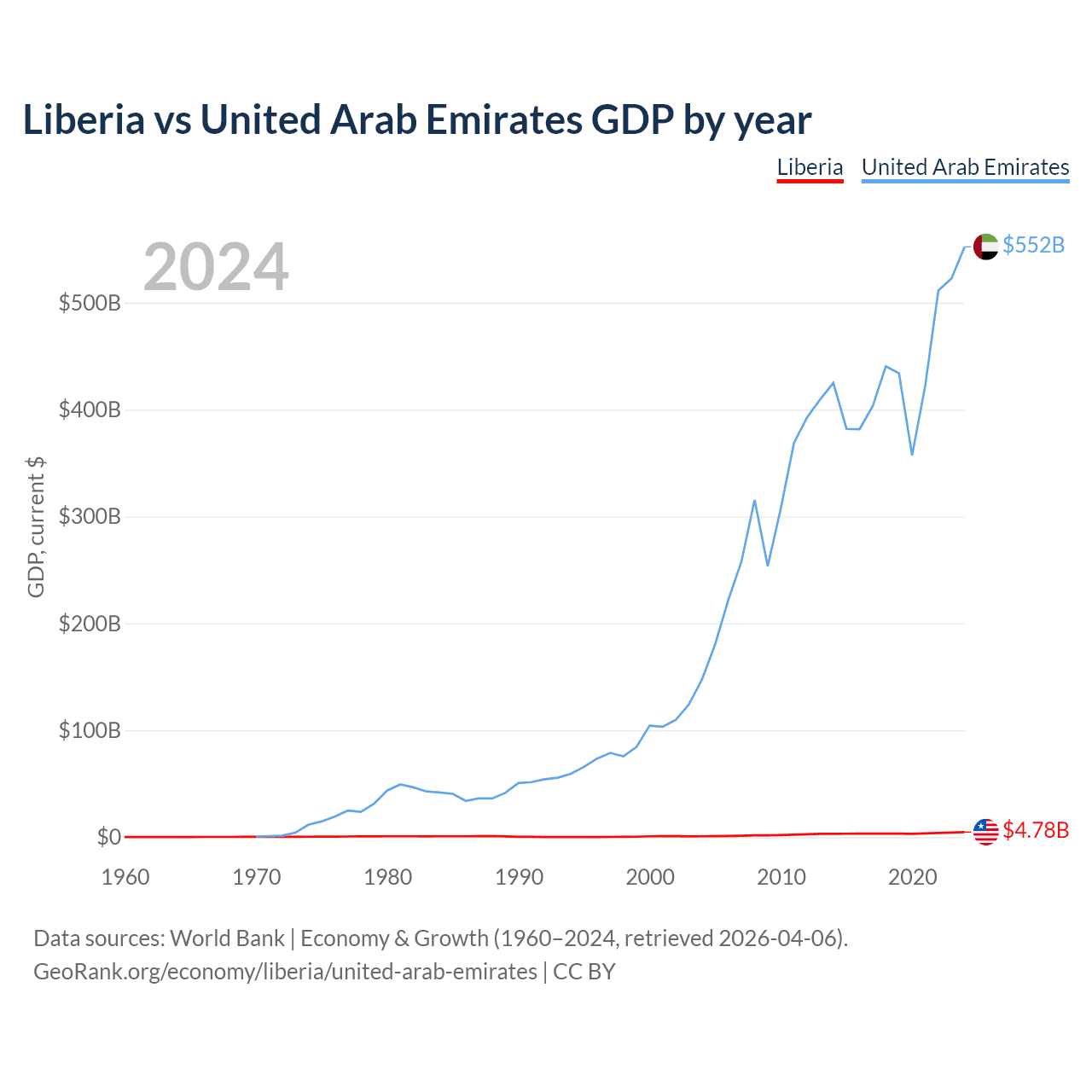 Liberia has a GDP of $4.78B compared to $552B for the United Arab Emirates, ranking 163/197 and 27/197 by economy size, respectively.