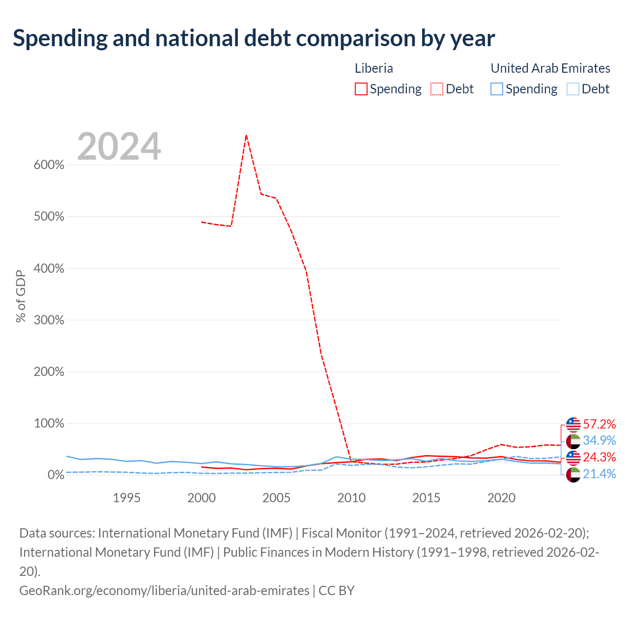 Liberia has $2.73B in government debt (57.2% of GDP), compared to $193B (34.9% of GDP) in the United Arab Emirates.
