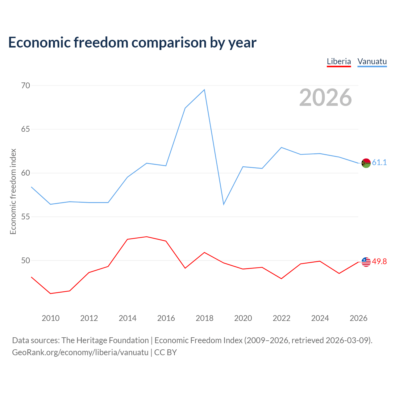 The Economic Freedom Index for Liberia is 49.8, ranking 163/197, compared to 61.1 for Vanuatu, ranking 92/197. The chart above displays a comparison of annual changes in economic freedom indexes.