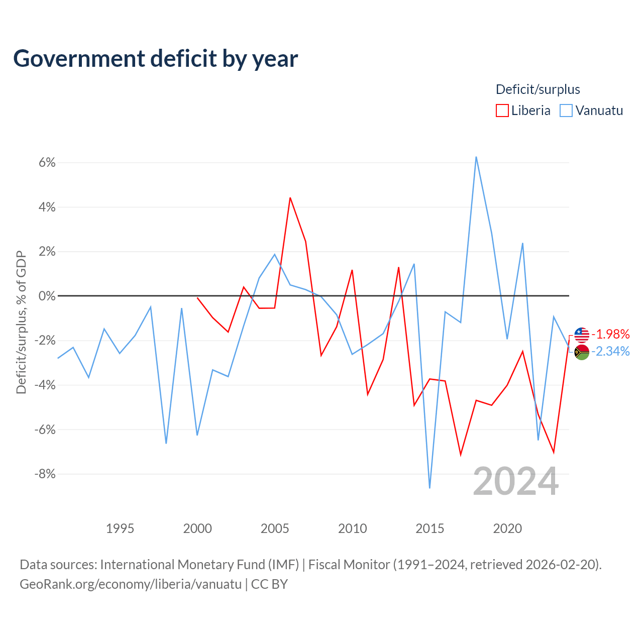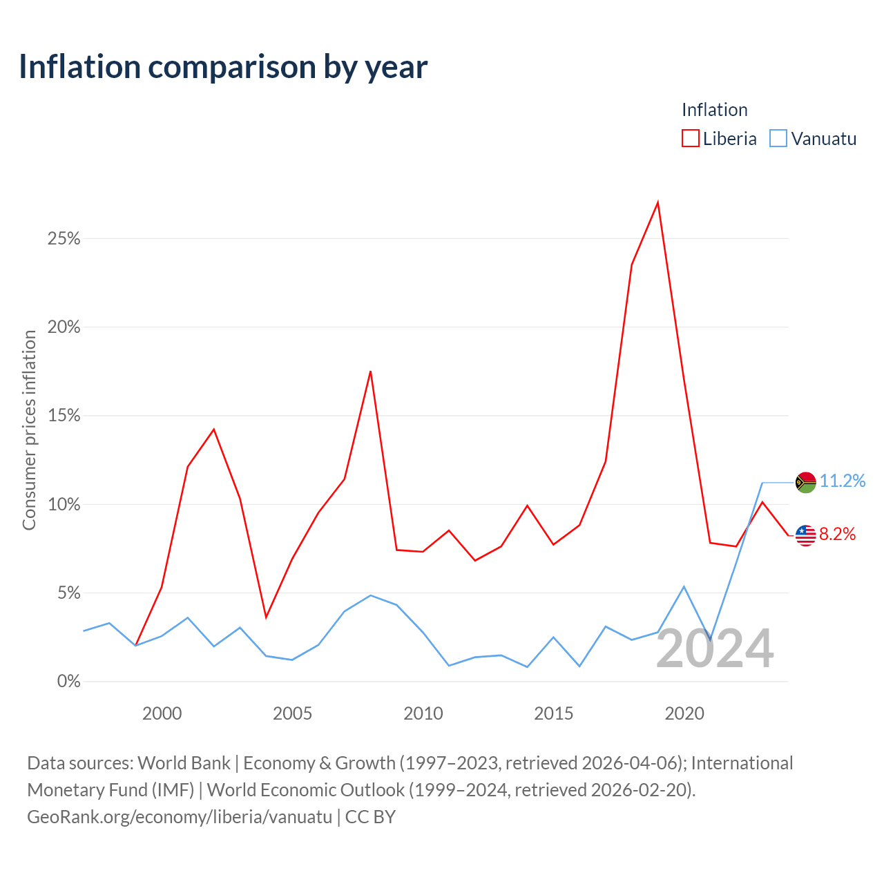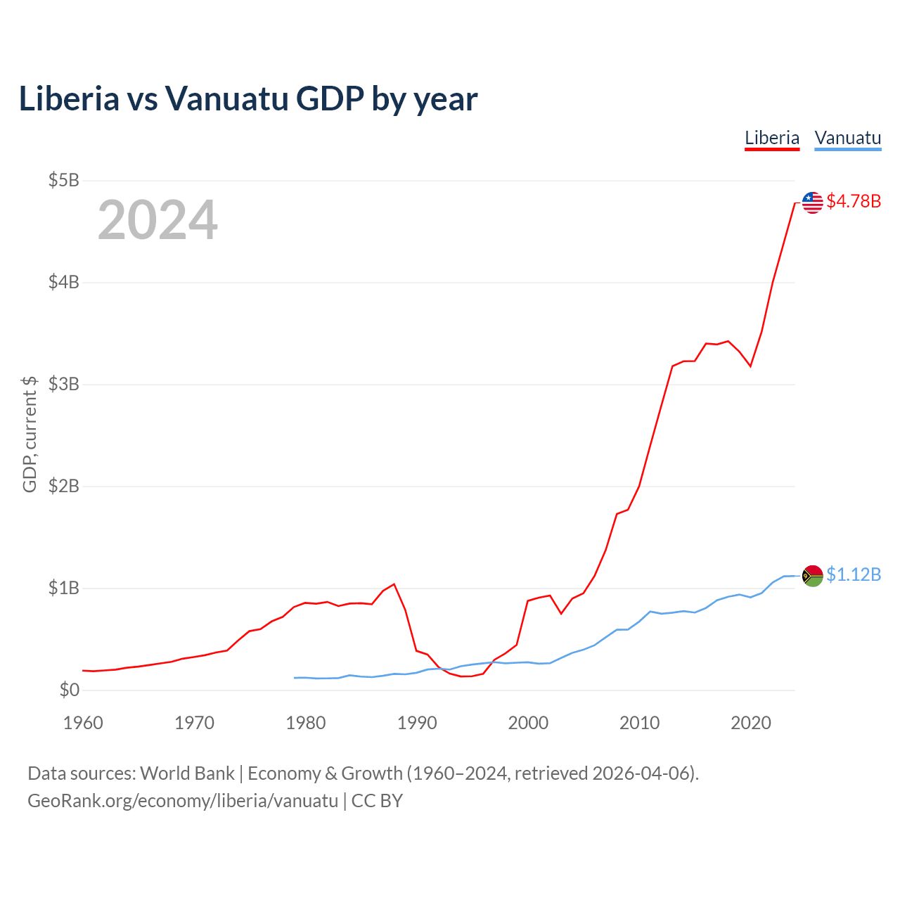 Liberia has a GDP of $4.78B compared to $1.12B for Vanuatu, ranking 163/197 and 188/197 by economy size, respectively.