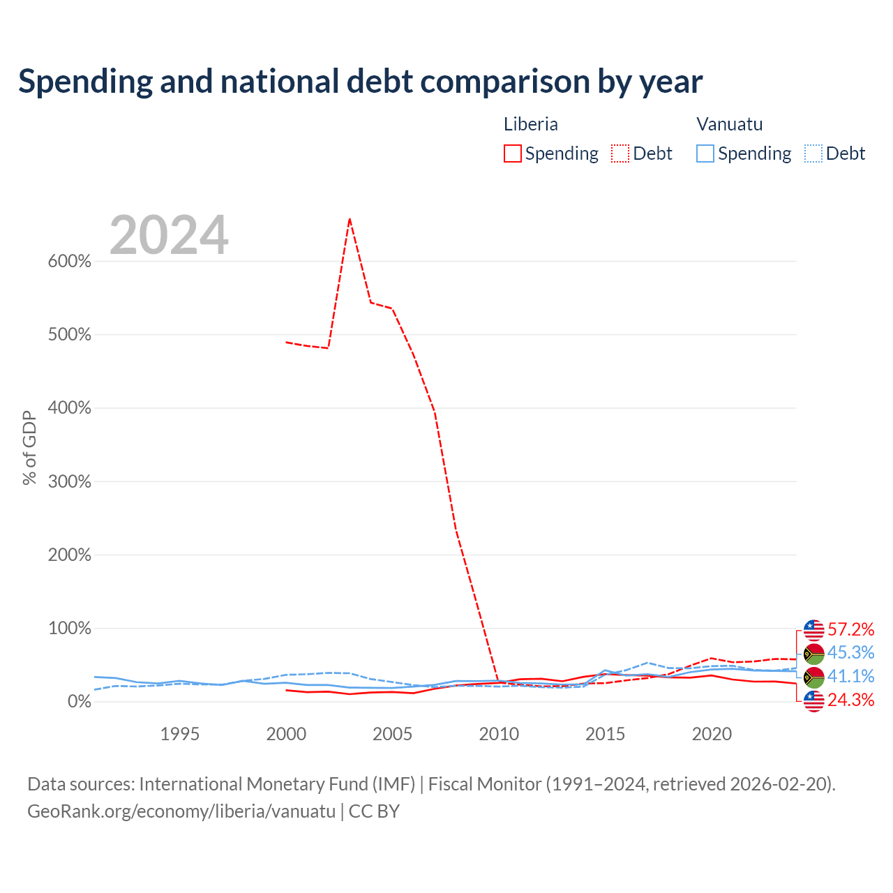 Liberia has $2.73B in government debt (57.2% of GDP), compared to $507M (45.3% of GDP) in Vanuatu.