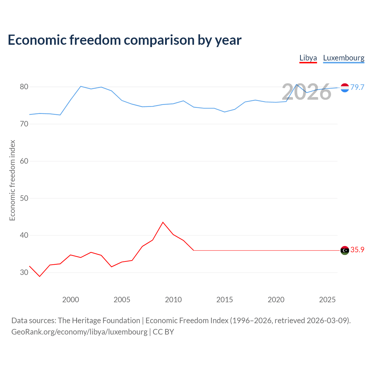 The Economic Freedom Index for Libya is 35.9, ranking 189/197, compared to 79.7 for Luxembourg, ranking 7/197. The chart above displays a comparison of annual changes in economic freedom indexes.