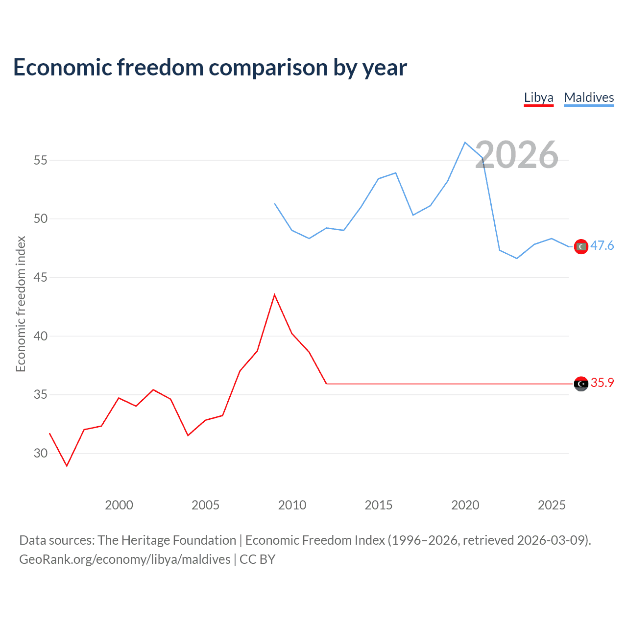 The Economic Freedom Index for Libya is 35.9, ranking 189/197, compared to 47.6 for Maldives, ranking 174/197. The chart above displays a comparison of annual changes in economic freedom indexes.