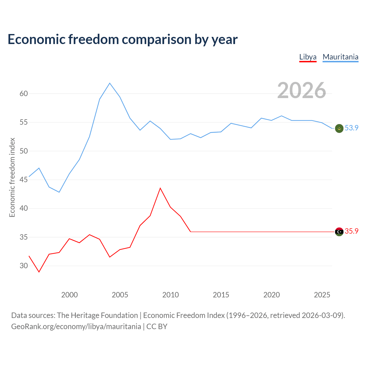 The Economic Freedom Index for Libya is 35.9, ranking 189/197, compared to 53.9 for Mauritania, ranking 136/197. The chart above displays a comparison of annual changes in economic freedom indexes.