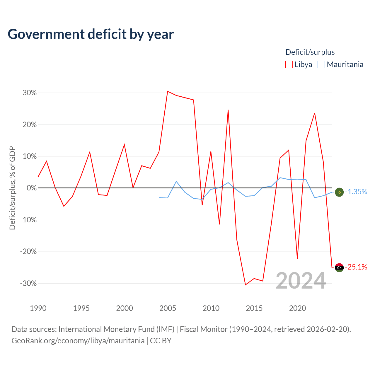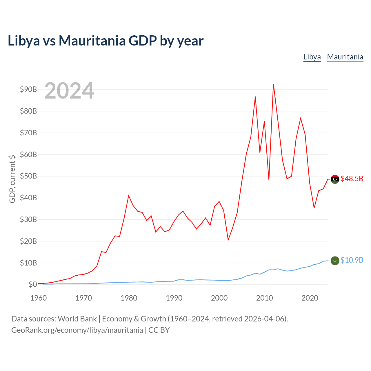 Libya has a GDP of $48.5B compared to $10.9B for Mauritania, ranking 95/197 and 153/197 by economy size, respectively.