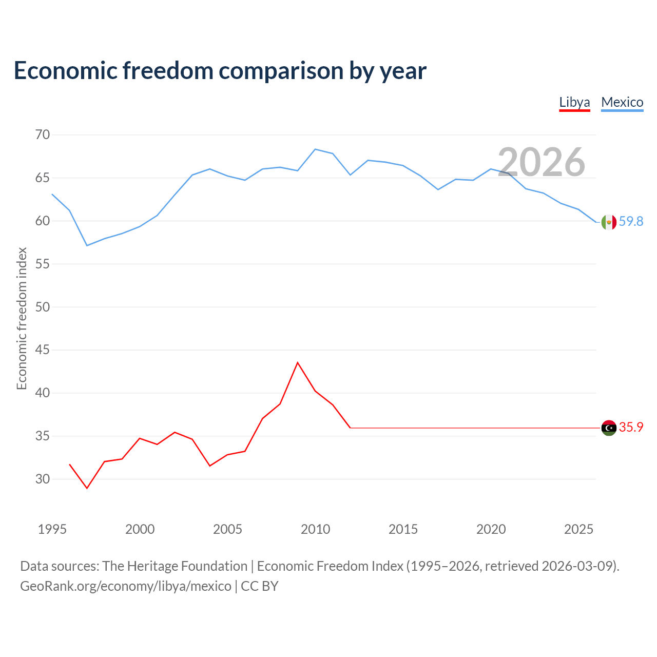 The Economic Freedom Index for Libya is 35.9, ranking 189/197, compared to 59.8 for Mexico, ranking 102/197. The chart above displays a comparison of annual changes in economic freedom indexes.