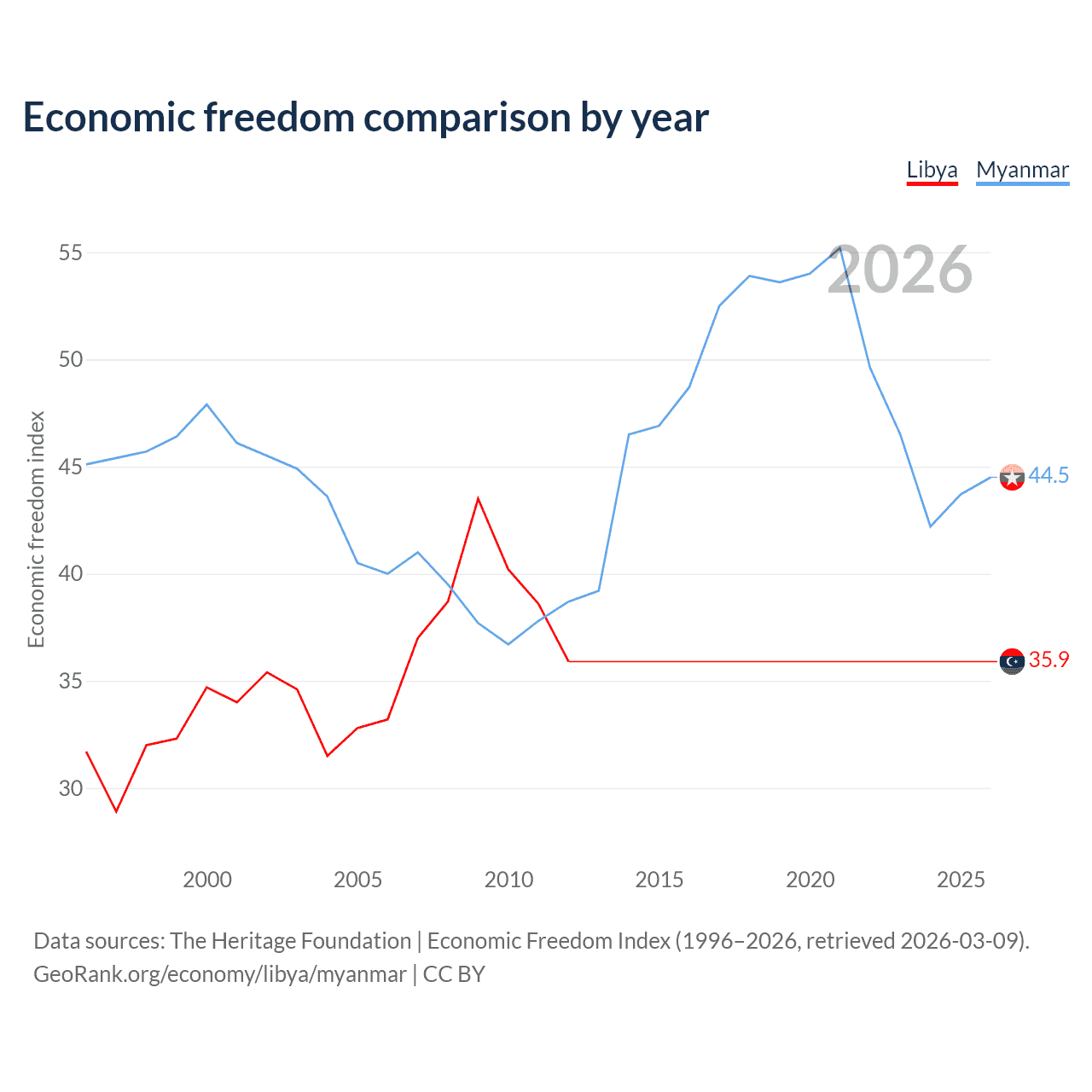 The Economic Freedom Index for Libya is 35.9, ranking 189/197, compared to 44.5 for Myanmar, ranking 180/197. The chart above displays a comparison of annual changes in economic freedom indexes.