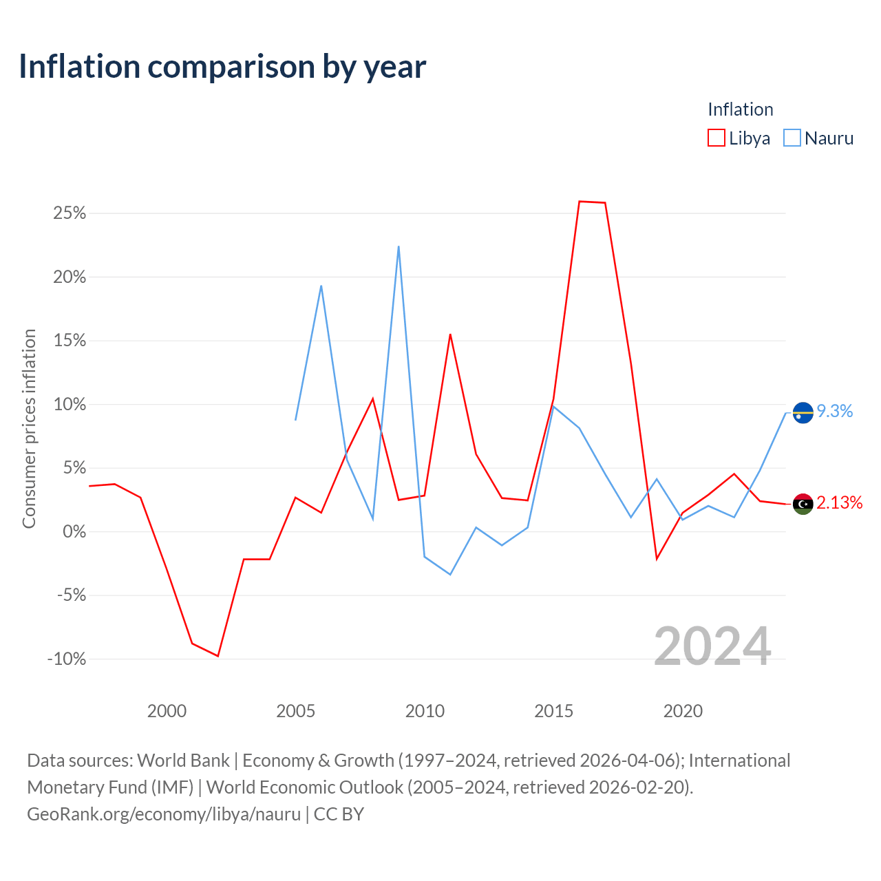 Over the past 20 years, Libya has recorded an average annual inflation rate of 6.95%, compared with 4.84% in Nauru. In 2024, inflation was 2.13% in Libya and 9.3% in Nauru.