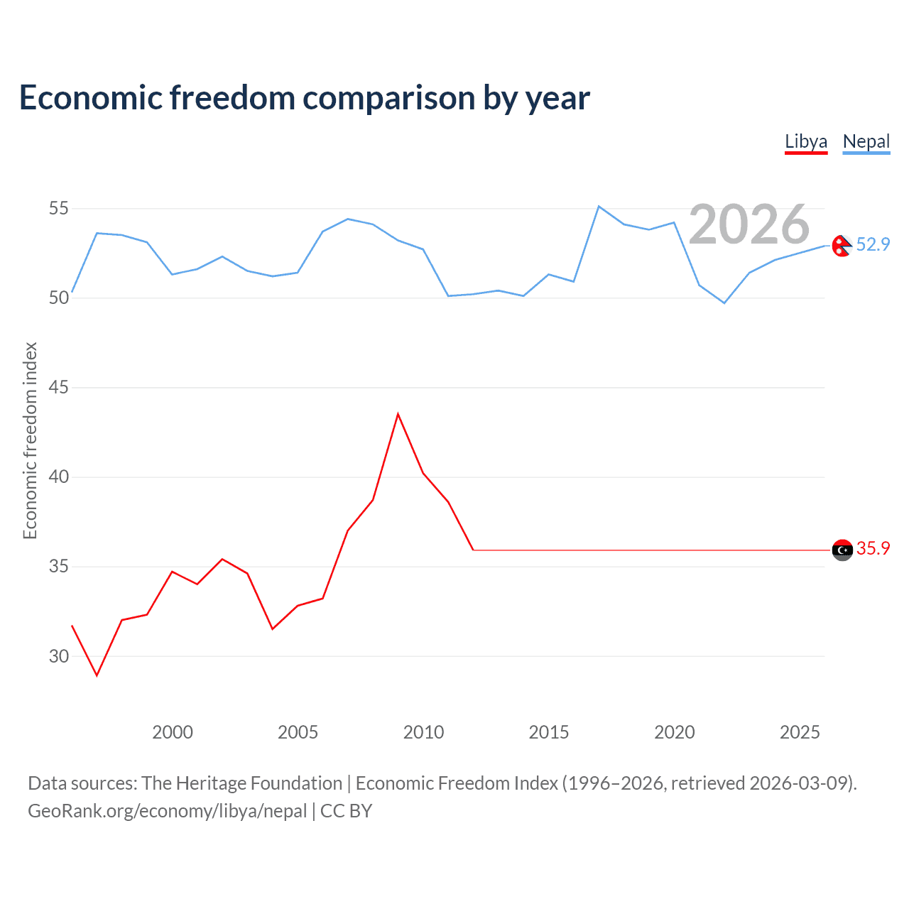 The Economic Freedom Index for Libya is 35.9, ranking 189/197, compared to 52.9 for Nepal, ranking 144/197. The chart above displays a comparison of annual changes in economic freedom indexes.