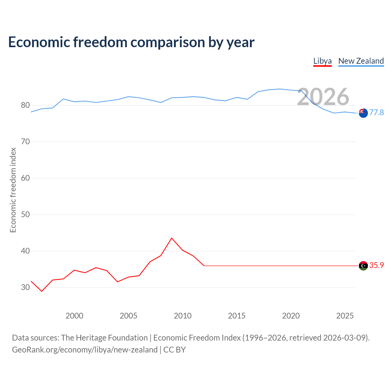 The Economic Freedom Index for Libya is 35.9, ranking 189/197, compared to 77.8 for New Zealand, ranking 13/197. The chart above displays a comparison of annual changes in economic freedom indexes.