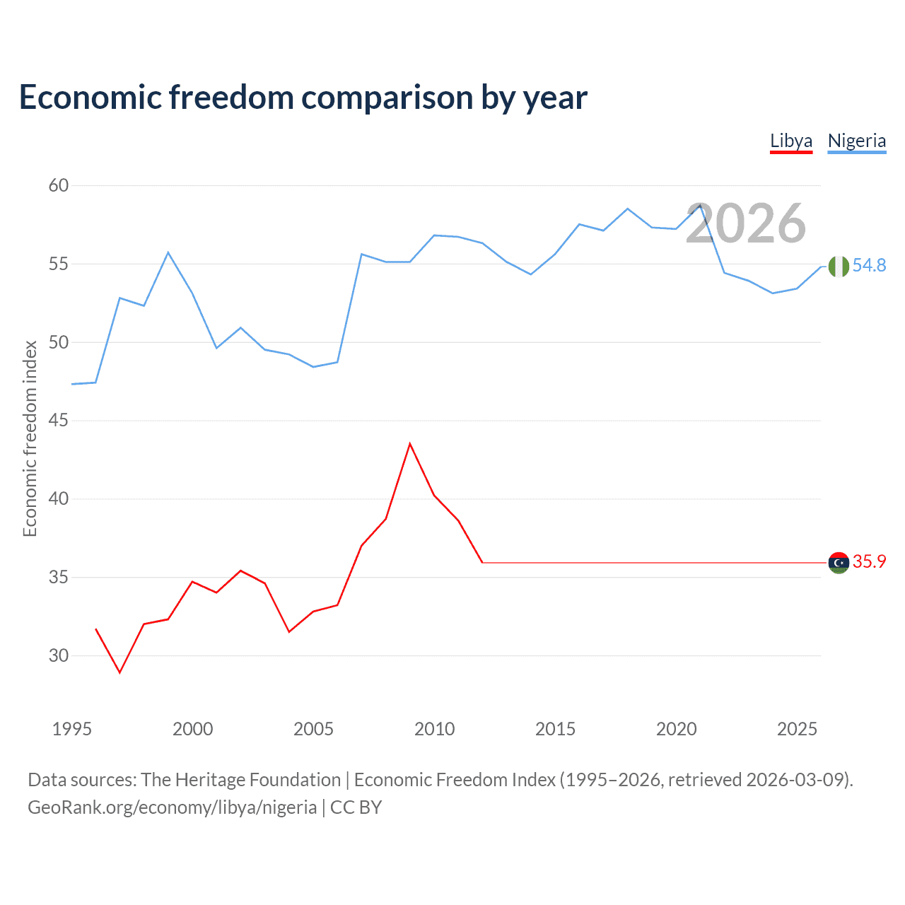 The Economic Freedom Index for Libya is 35.9, ranking 189/197, compared to 54.8 for Nigeria, ranking 132/197. The chart above displays a comparison of annual changes in economic freedom indexes.