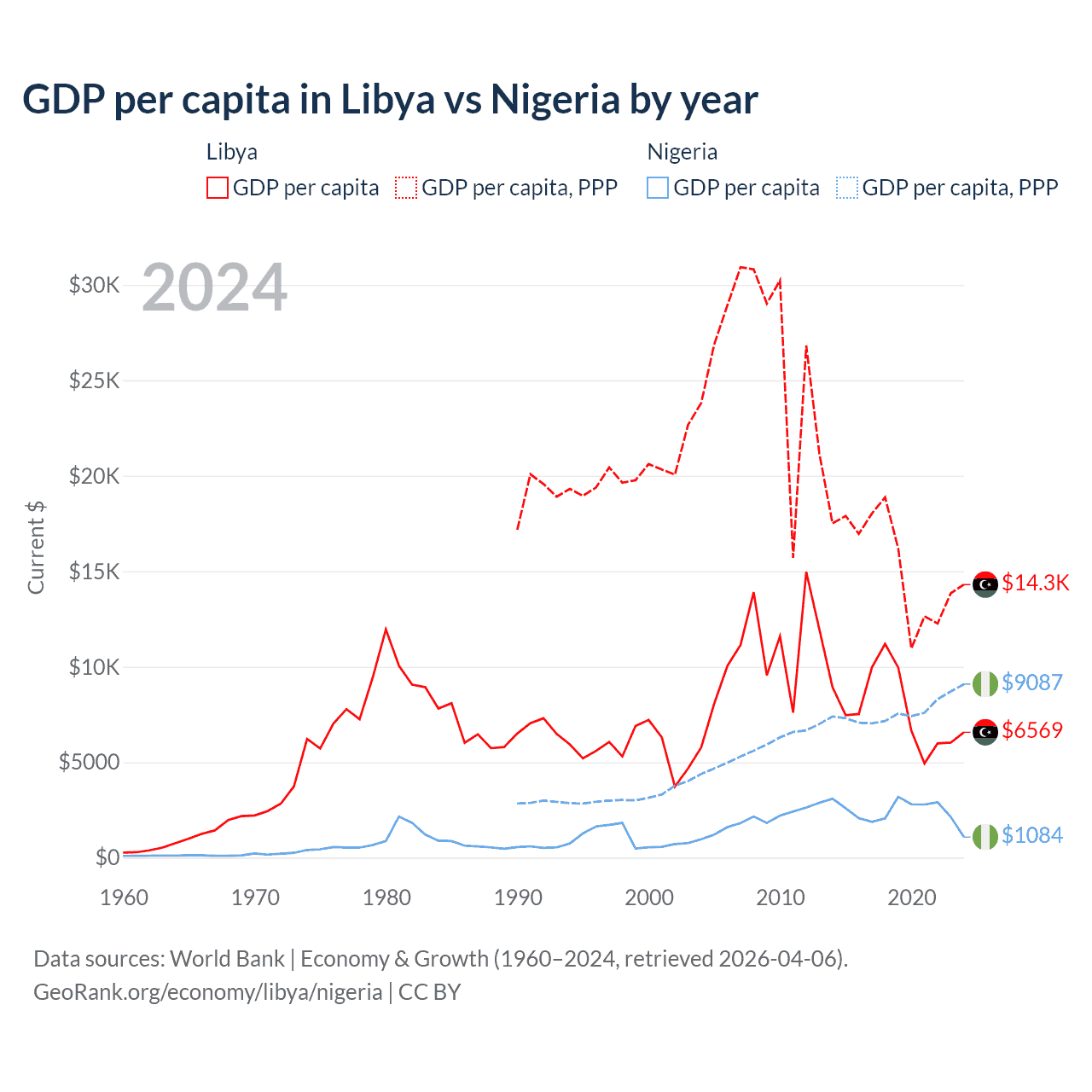 GDP per capita in Libya vs Nigeria by year