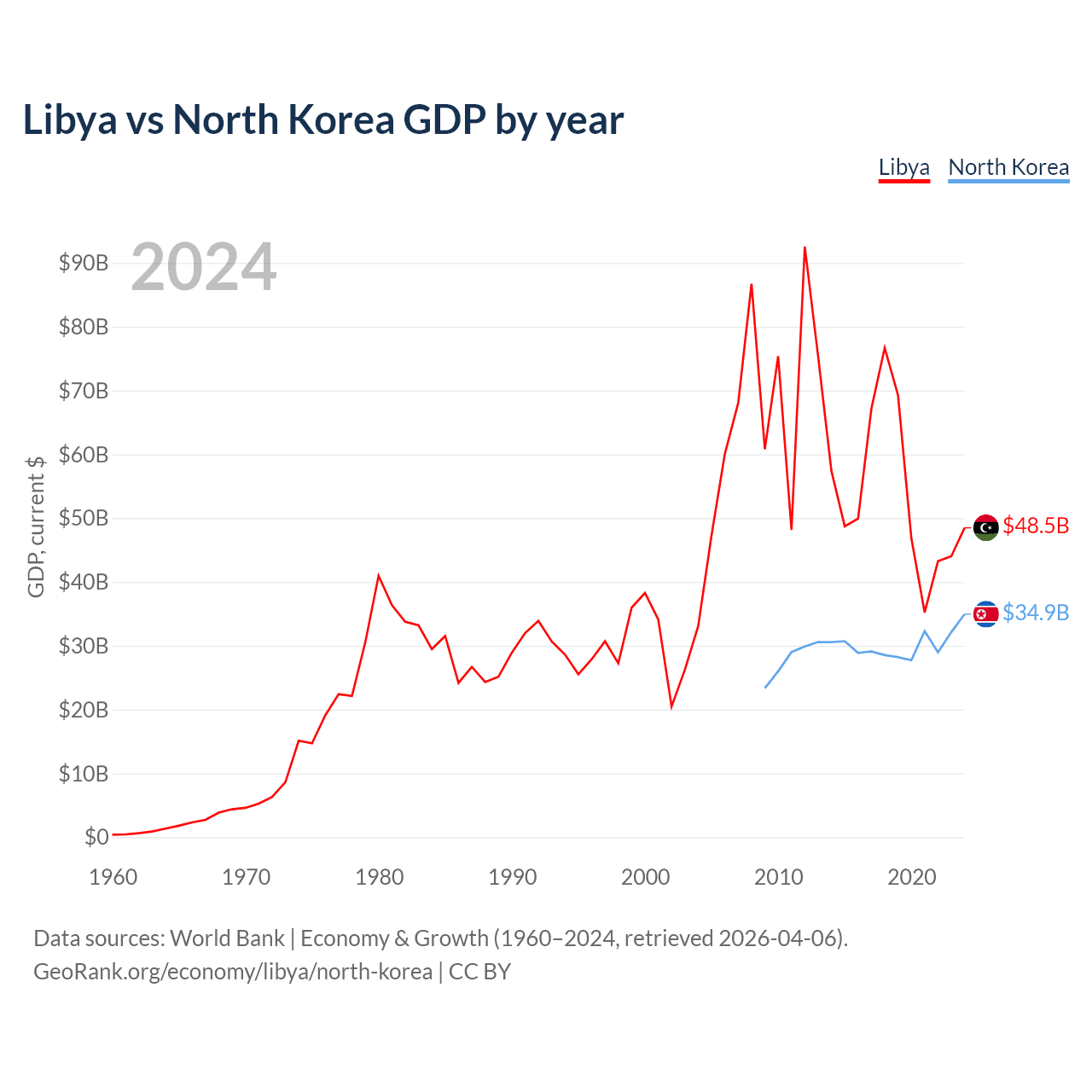 Libya has a GDP of $48.5B compared to $34.9B for North Korea, ranking 95/197 and 106/197 by economy size, respectively.