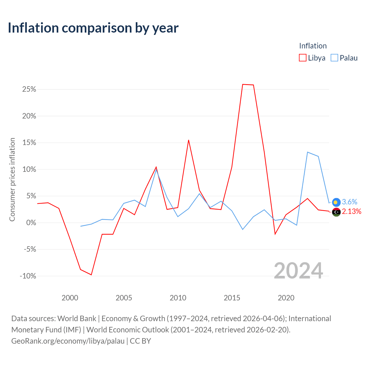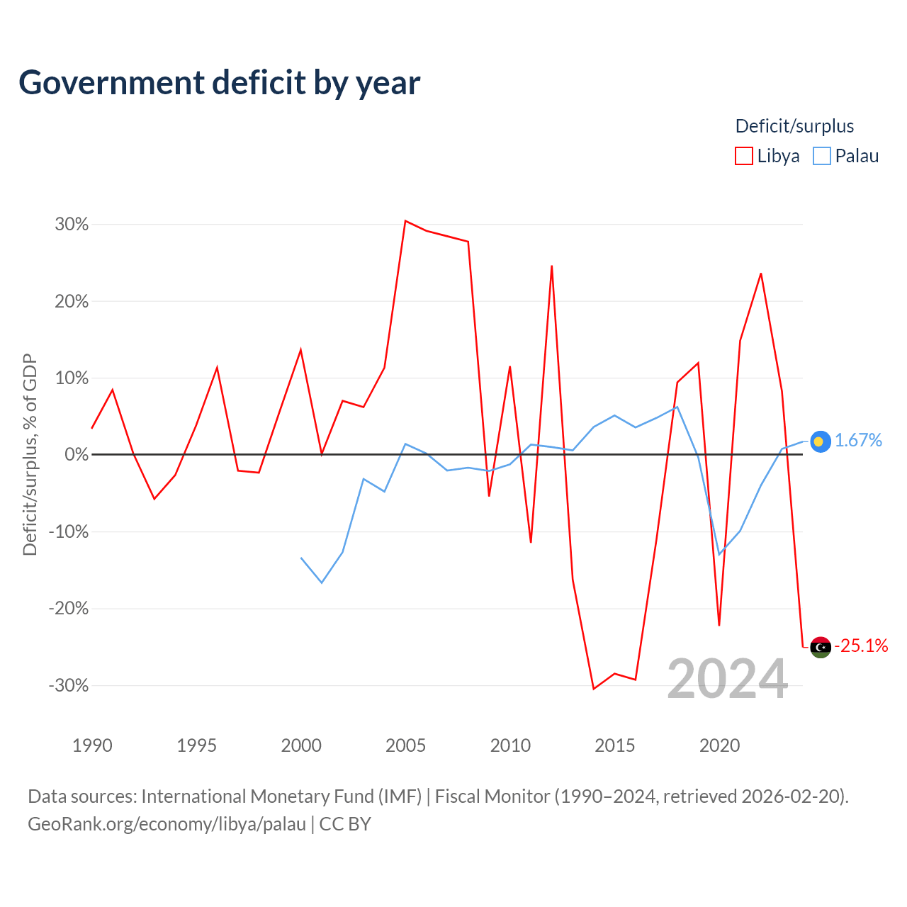 Libya has a GDP of $48.5B compared to $277M for Palau, ranking 95/197 and 194/197 by economy size, respectively.