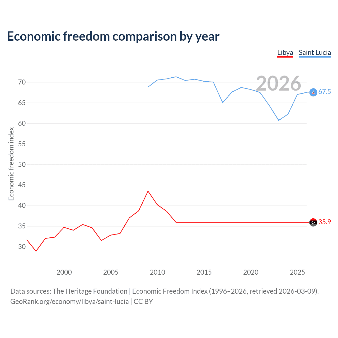 The Economic Freedom Index for Libya is 35.9, ranking 189/197, compared to 67.5 for Saint Lucia, ranking 57/197. The chart above displays a comparison of annual changes in economic freedom indexes.