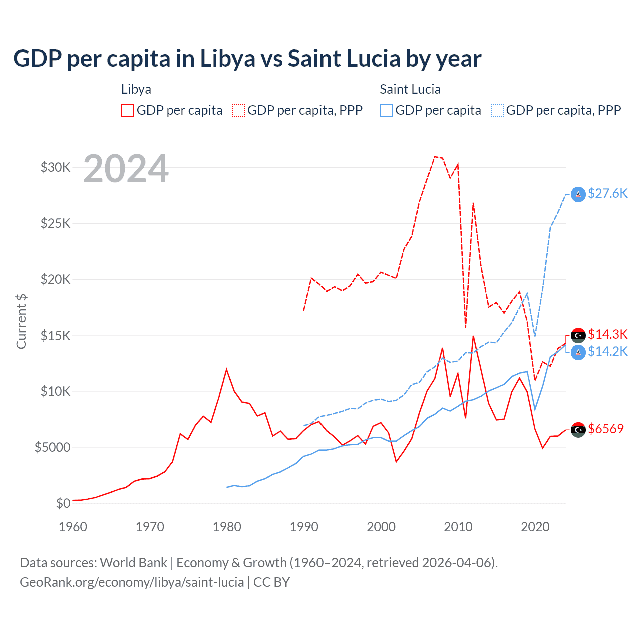 GDP per capita in Libya vs Saint Lucia by year