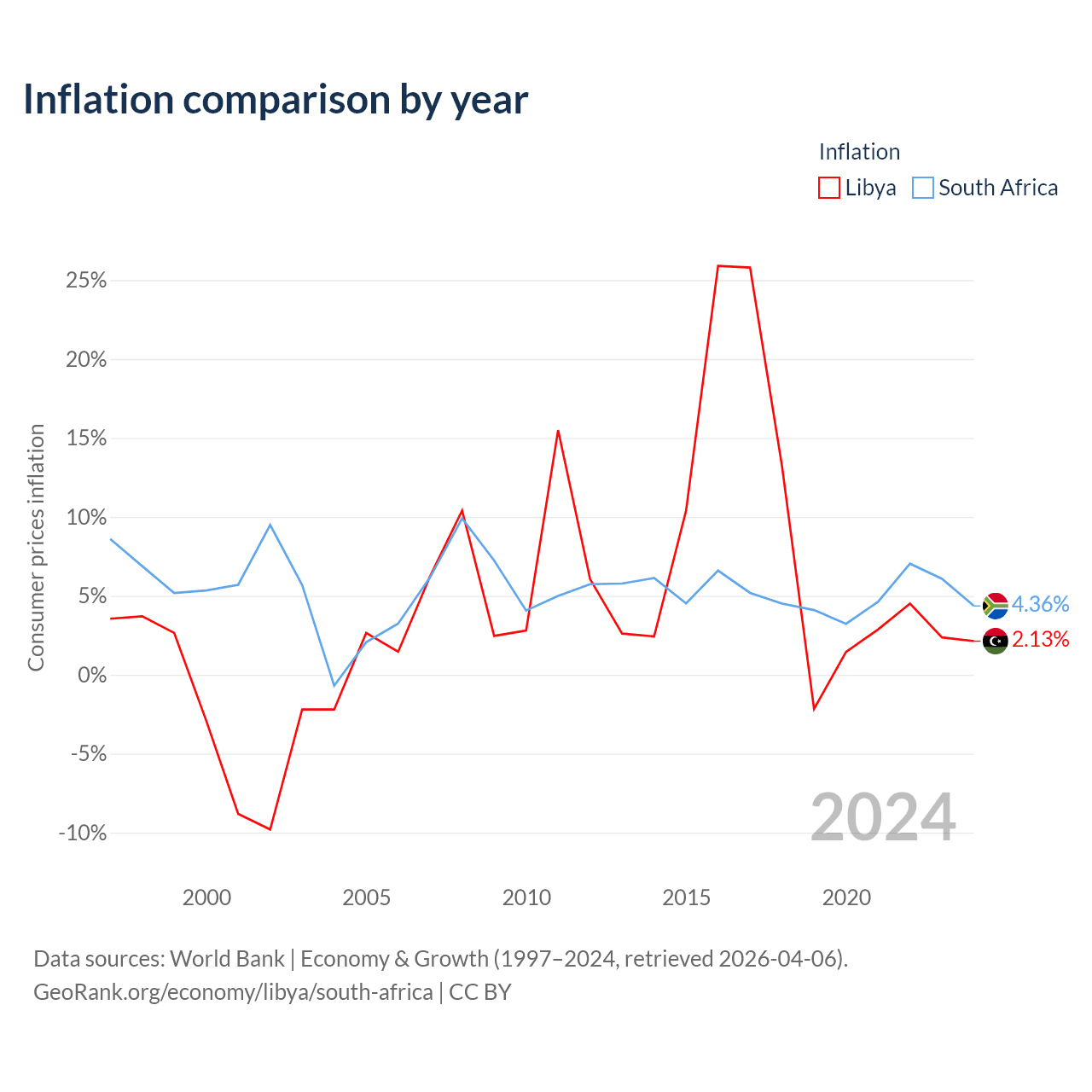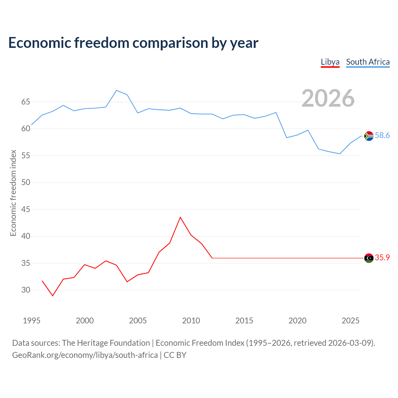 The Economic Freedom Index for Libya is 35.9, ranking 189/197, compared to 58.6 for South Africa, ranking 110/197. The chart above displays a comparison of annual changes in economic freedom indexes.
