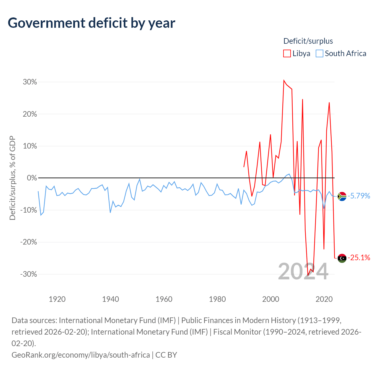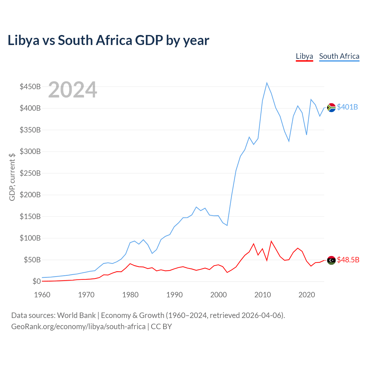 Libya has a GDP of $48.5B compared to $401B for South Africa, ranking 95/197 and 40/197 by economy size, respectively.