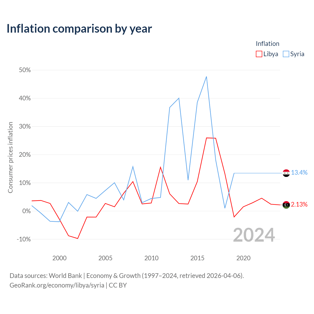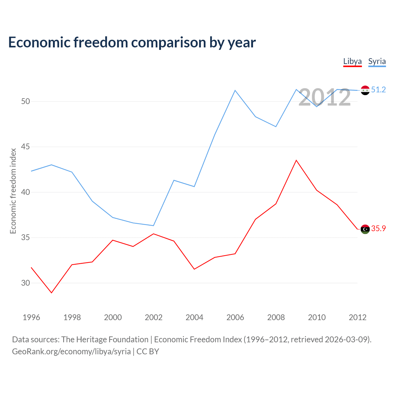The Economic Freedom Index for Libya is 35.9, ranking 189/197, compared to 51.2 for Syria, ranking 155/197. The chart above displays a comparison of annual changes in economic freedom indexes.