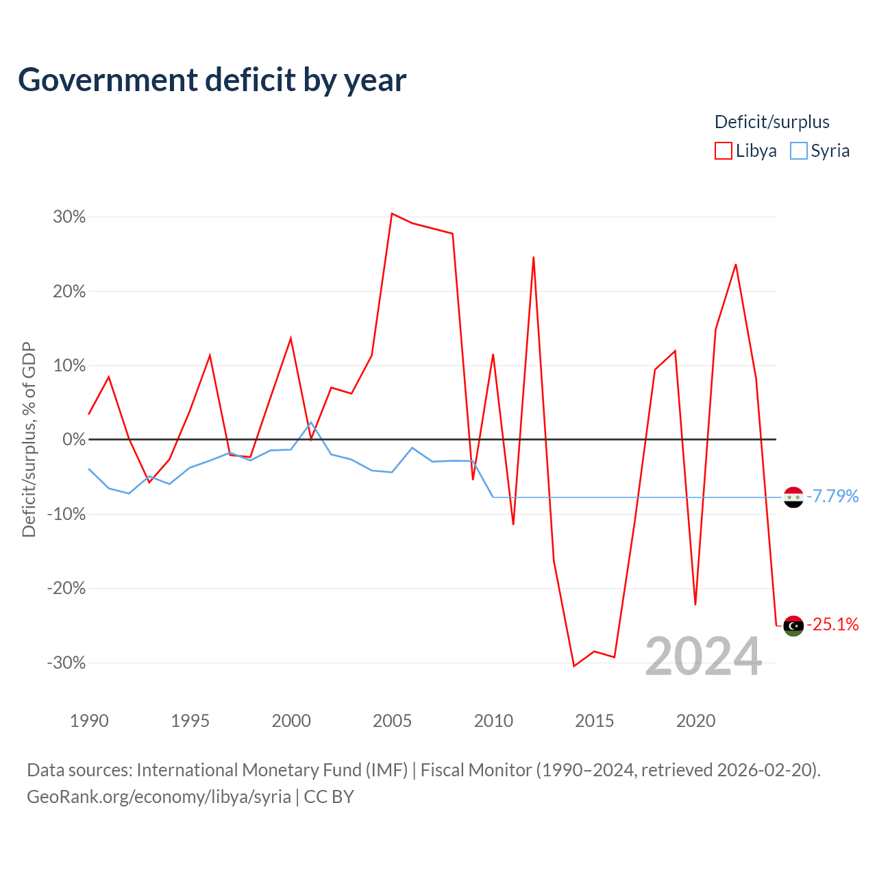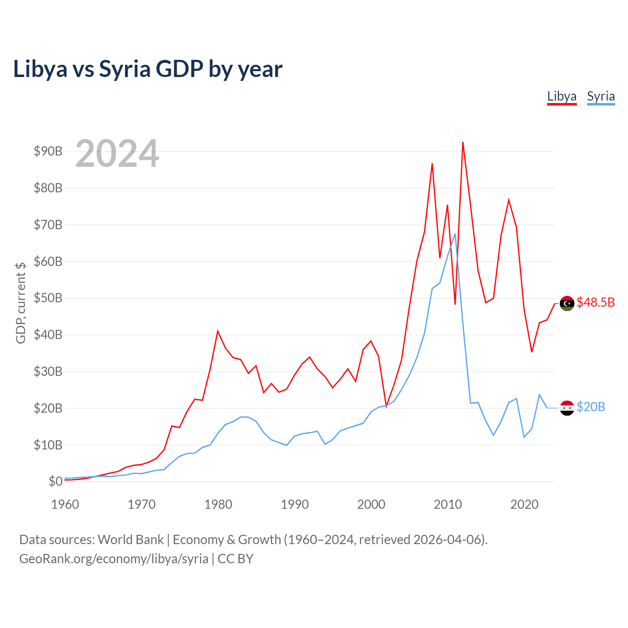 Libya has a GDP of $48.5B compared to $20B for Syria, ranking 95/197 and 129/197 by economy size, respectively.