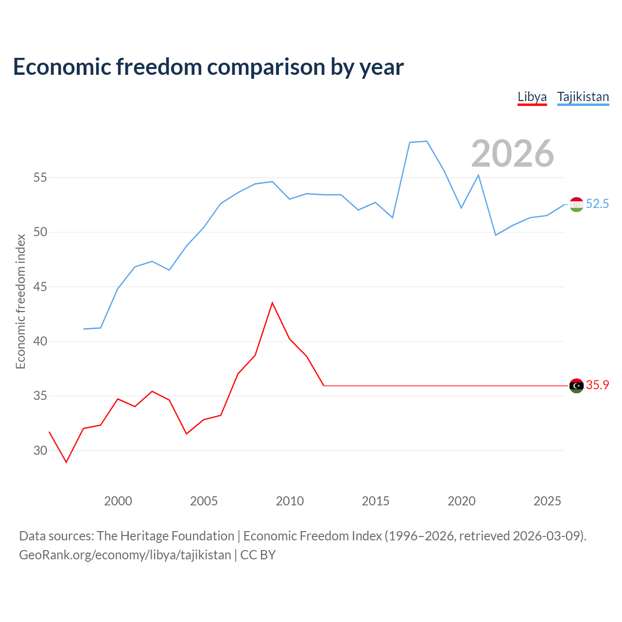 The Economic Freedom Index for Libya is 35.9, ranking 189/197, compared to 52.5 for Tajikistan, ranking 147/197. The chart above displays a comparison of annual changes in economic freedom indexes.