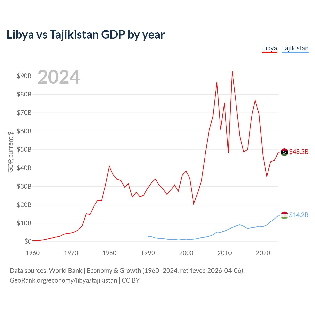 Libya has a GDP of $48.5B compared to $14.2B for Tajikistan, ranking 95/197 and 145/197 by economy size, respectively.