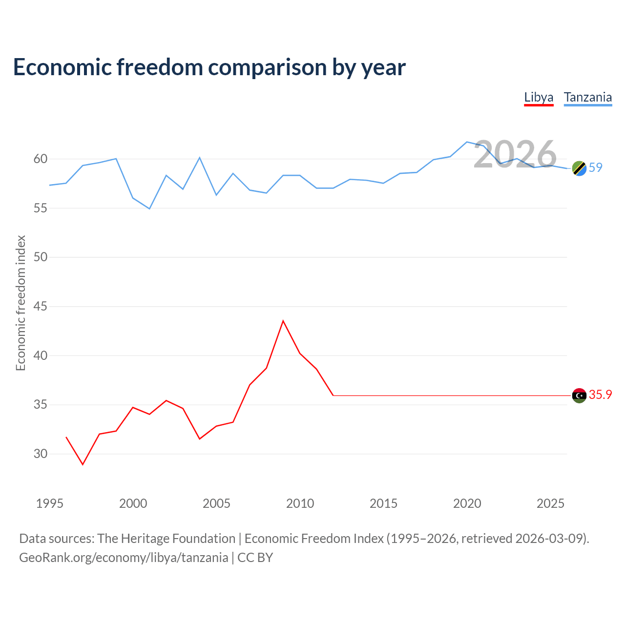 The Economic Freedom Index for Libya is 35.9, ranking 189/197, compared to 59 for Tanzania, ranking 106/197. The chart above displays a comparison of annual changes in economic freedom indexes.