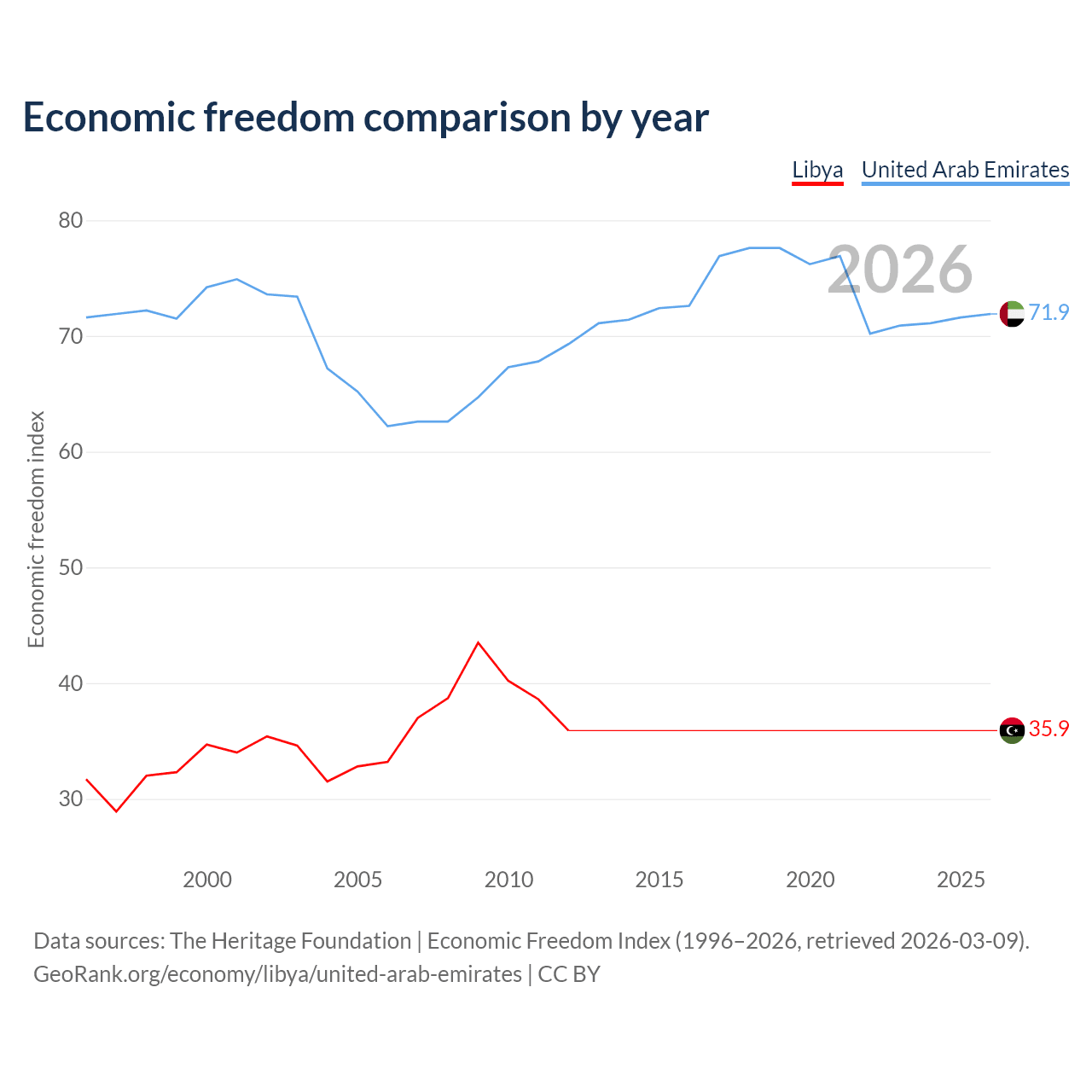 The Economic Freedom Index for Libya is 35.9, ranking 189/197, compared to 71.9 for the United Arab Emirates, ranking 29/197. The chart above displays a comparison of annual changes in economic freedom indexes.