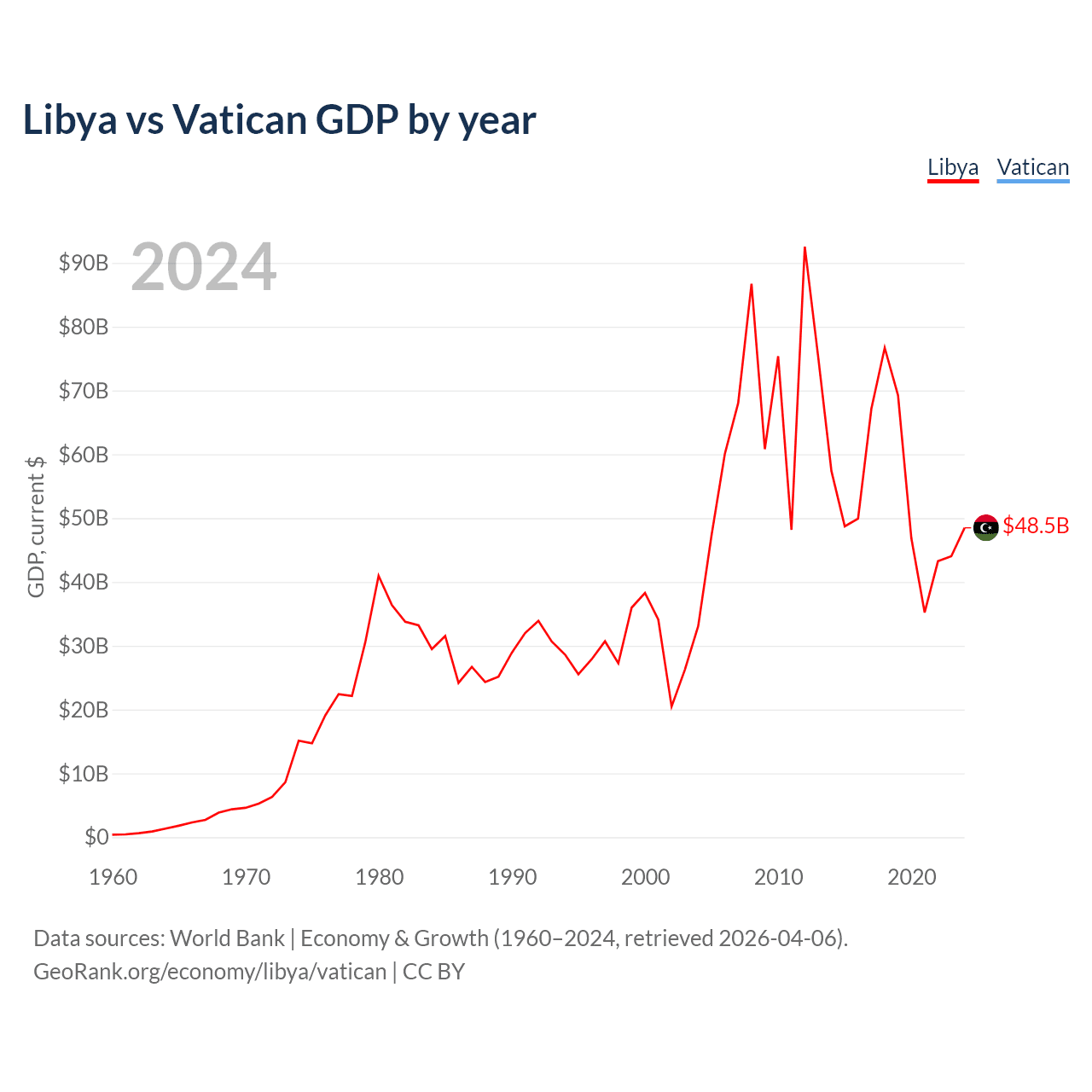 Libya has a GDP of $48.5B compared to $19.8M for the Vatican, ranking 95/197 and 197/197 by economy size, respectively.