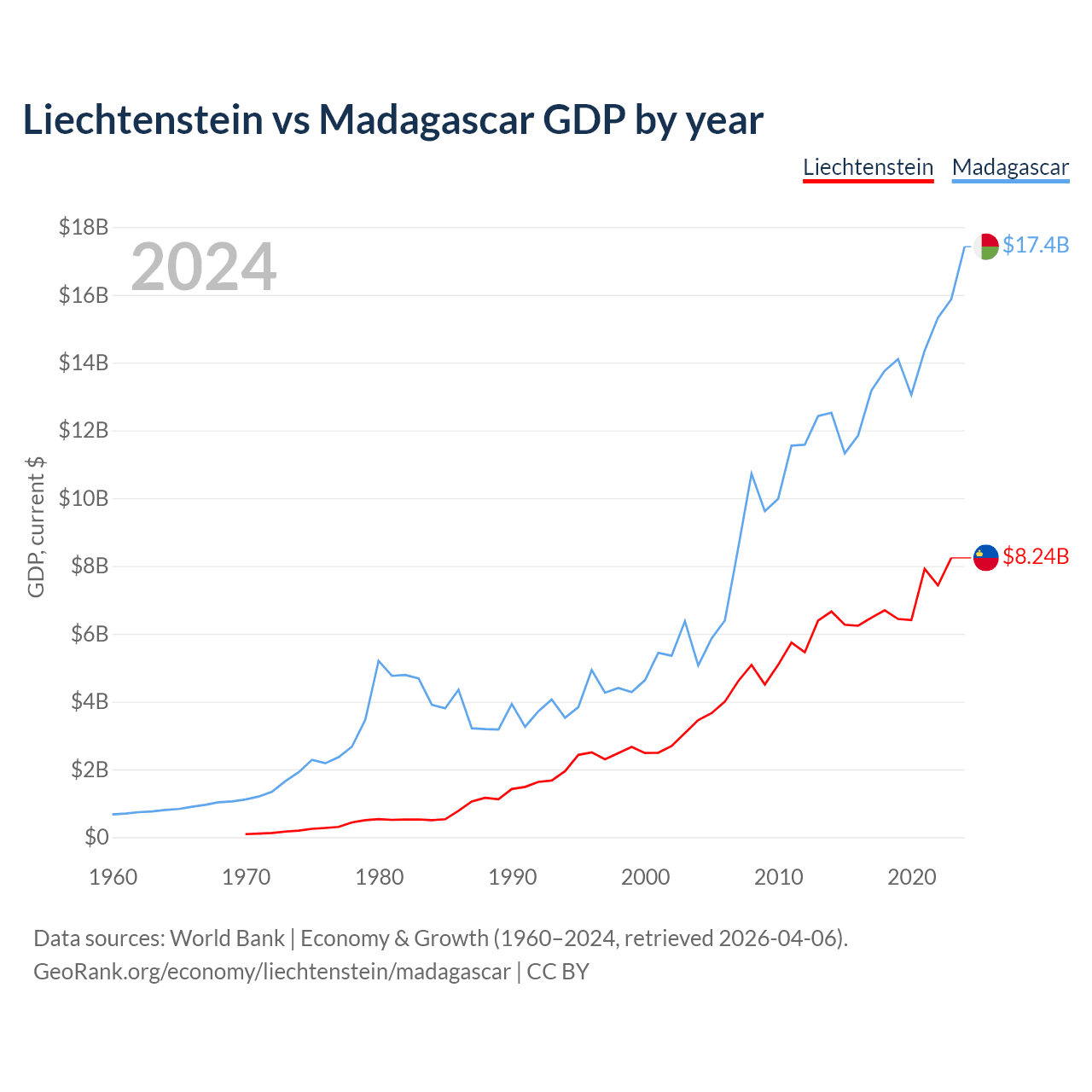 Liechtenstein has a GDP of $8.24B compared to $17.4B for Madagascar, ranking 156/197 and 136/197 by economy size, respectively.