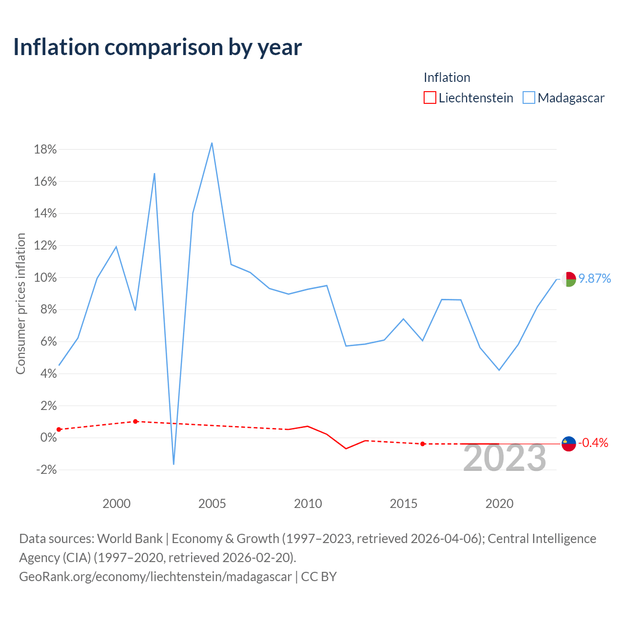 Over the past 24 years, Liechtenstein has recorded an average annual inflation rate of 0.04%, compared with 8.48% in Madagascar. In 2020, inflation was -0.4% in Liechtenstein and 9.87% in Madagascar.