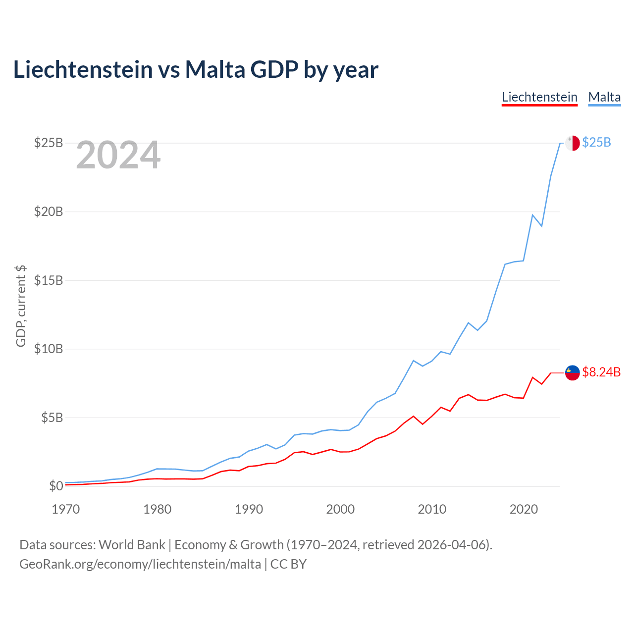 Liechtenstein has a GDP of $8.24B compared to $25B for Malta, ranking 156/197 and 119/197 by economy size, respectively.