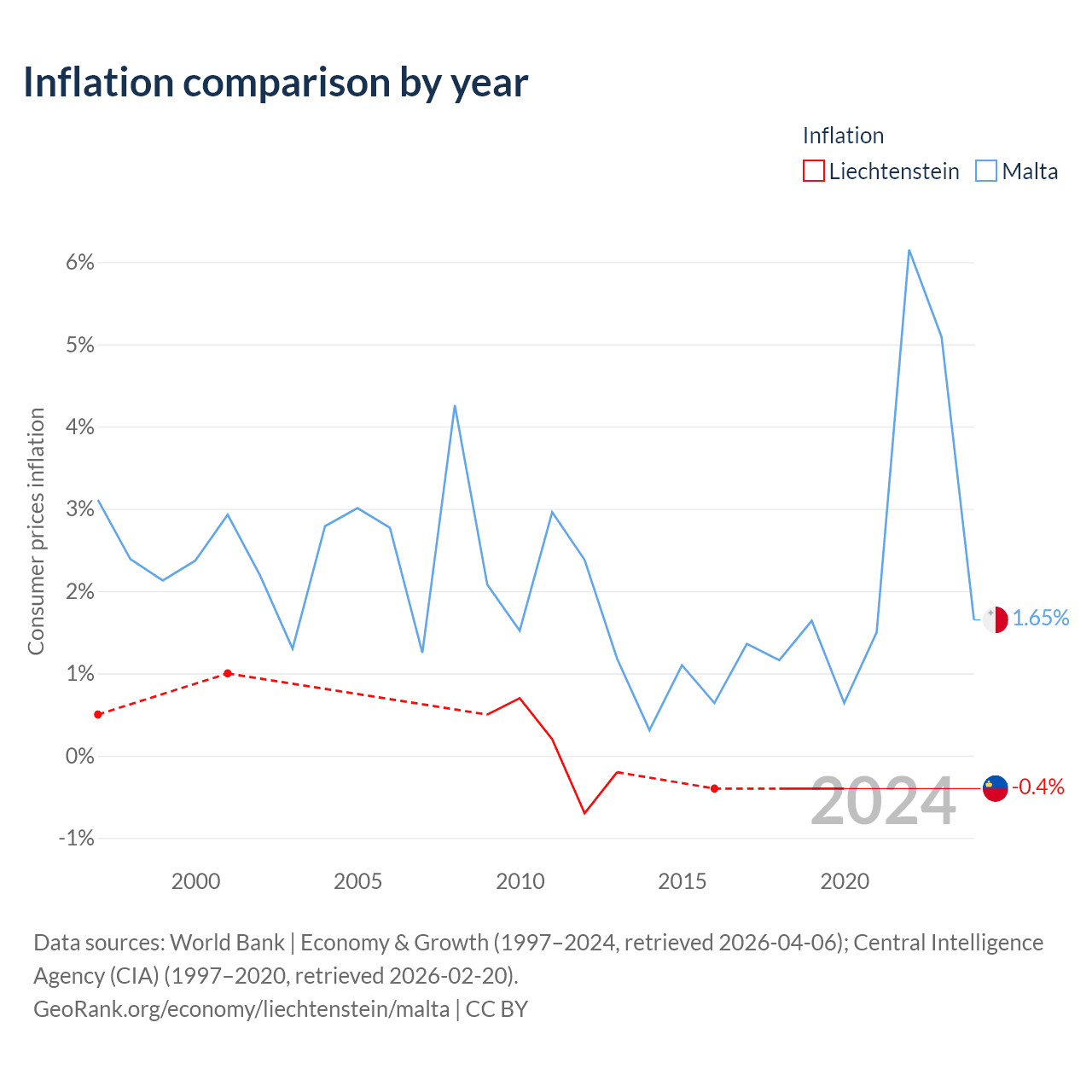 Over the past 24 years, Liechtenstein has recorded an average annual inflation rate of 0.04%, compared with 1.98% in Malta. In 2020, inflation was -0.4% in Liechtenstein and 1.65% in Malta.