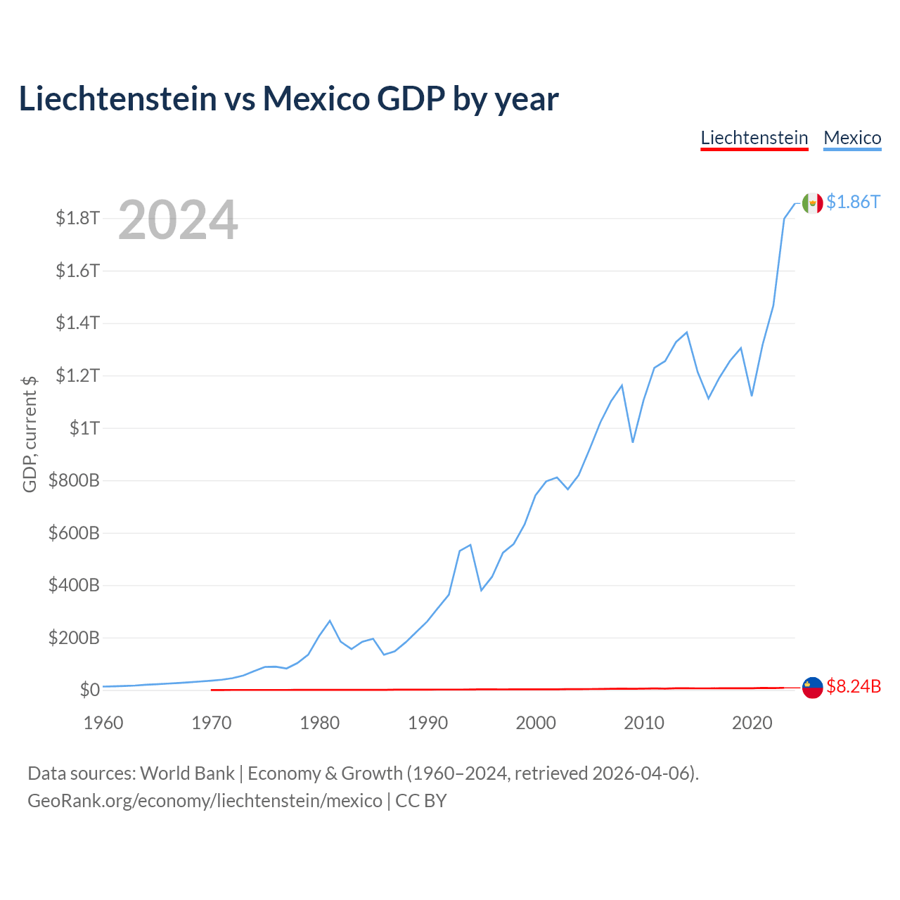 Liechtenstein has a GDP of $8.24B compared to $1.86T for Mexico, ranking 156/197 and 13/197 by economy size, respectively.