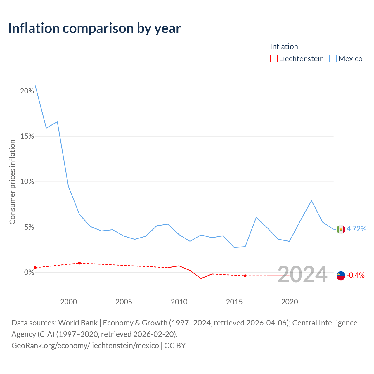 Over the past 24 years, Liechtenstein has recorded an average annual inflation rate of 0.04%, compared with 6.18% in Mexico. In 2020, inflation was -0.4% in Liechtenstein and 4.72% in Mexico.