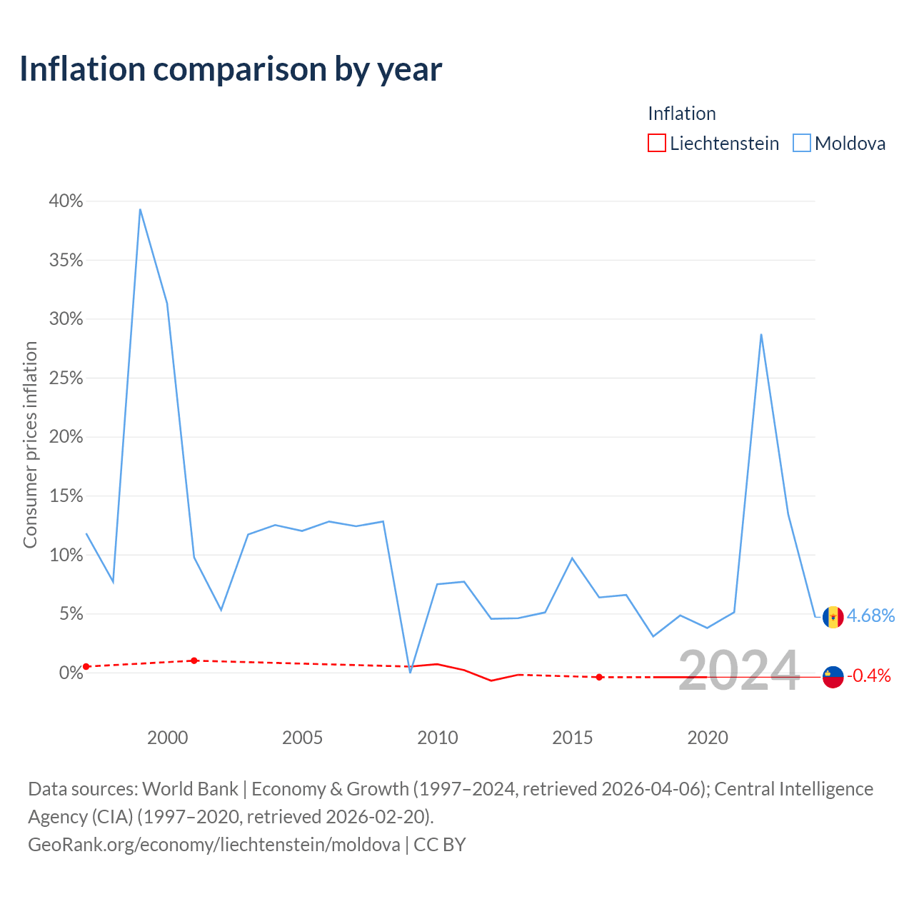 Over the past 24 years, Liechtenstein has recorded an average annual inflation rate of 0.04%, compared with 10.1% in Moldova. In 2020, inflation was -0.4% in Liechtenstein and 4.68% in Moldova.