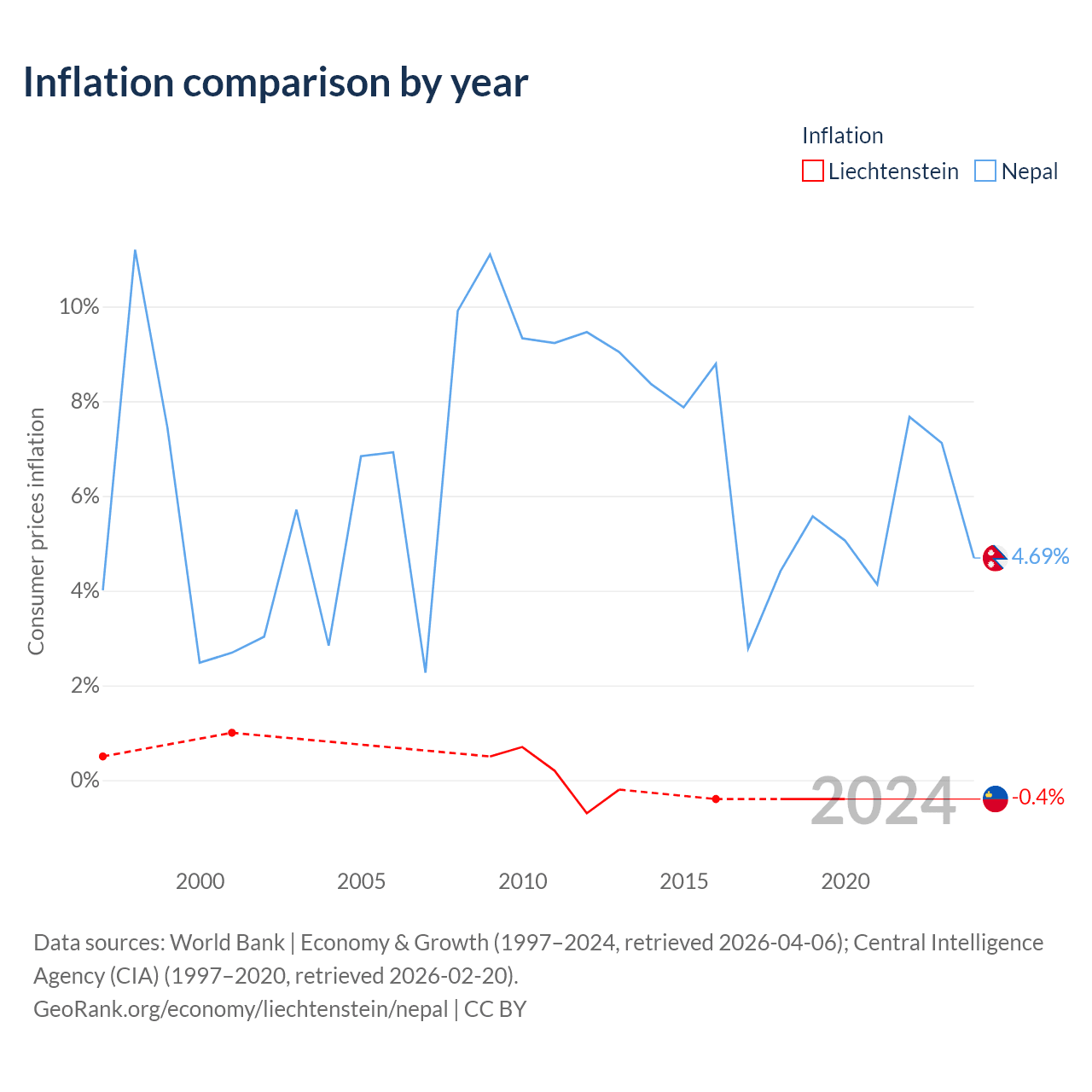 Over the past 24 years, Liechtenstein has recorded an average annual inflation rate of 0.04%, compared with 6.52% in Nepal. In 2020, inflation was -0.4% in Liechtenstein and 4.69% in Nepal.