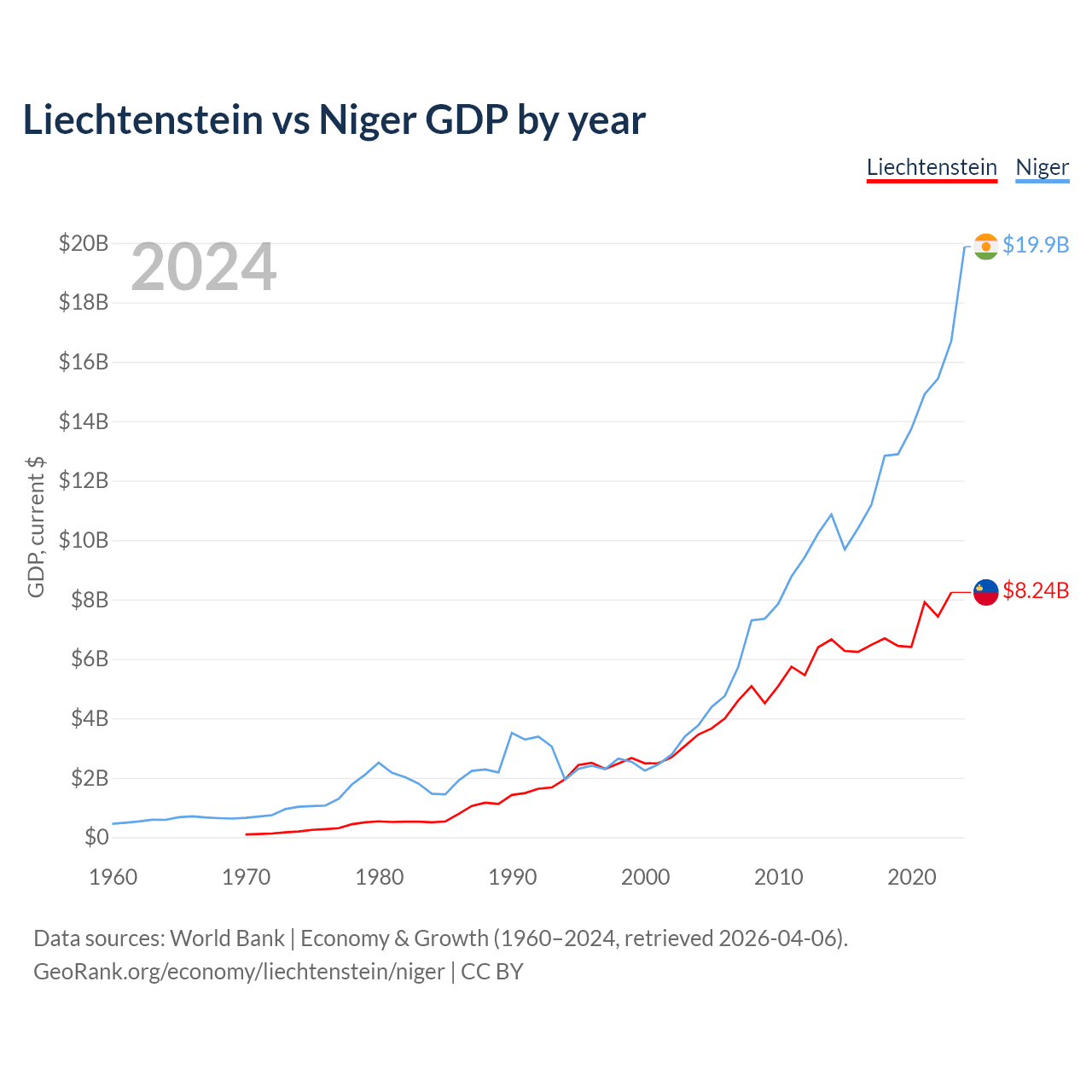 Liechtenstein has a GDP of $8.24B compared to $19.9B for Niger, ranking 156/197 and 130/197 by economy size, respectively.