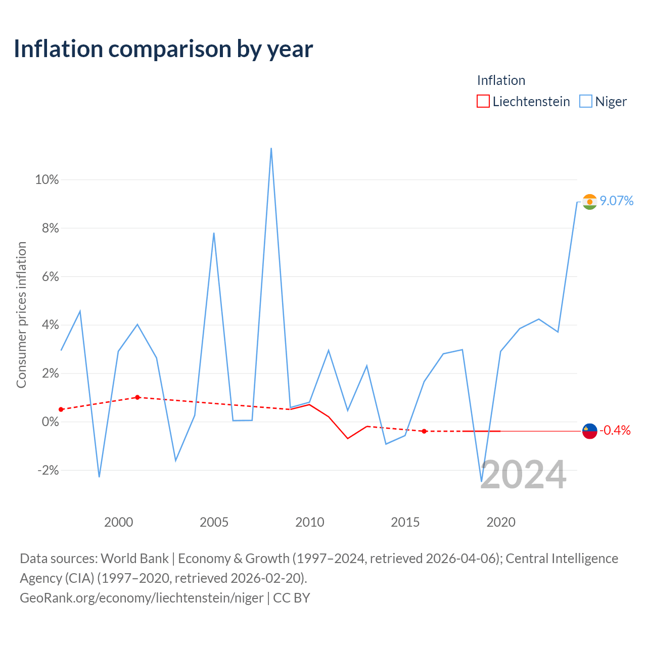 Over the past 24 years, Liechtenstein has recorded an average annual inflation rate of 0.04%, compared with 1.92% in Niger. In 2020, inflation was -0.4% in Liechtenstein and 9.07% in Niger.